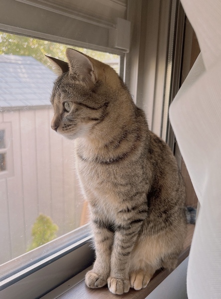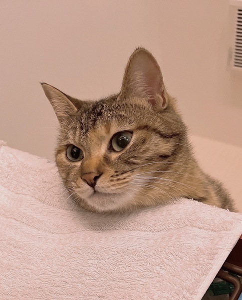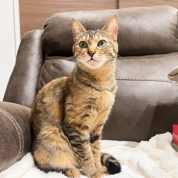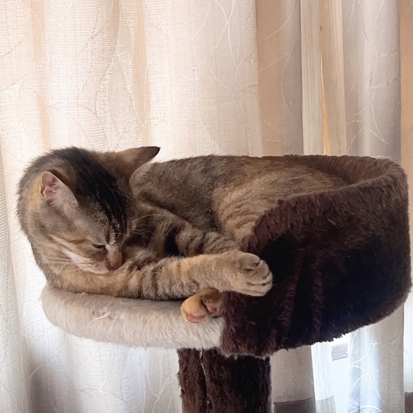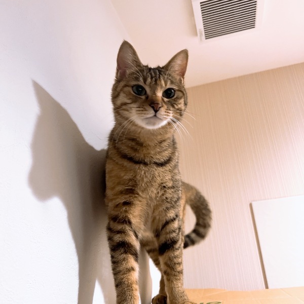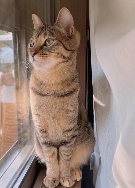 | 特徴(性格など) | 模様はキジトラで、目はまん丸のスリムな体型の女の子です。 性格は遊び好きで優しい子です。 慣れると触れますが数秒だったら大丈夫です。人の膝の上で休むのはあまり好きではないです。 カリカリよりもささみやパウチ等の柔らかい餌を好んで食べます。 人間のご飯や他の猫の餌を奪ったりはしないのですが、他の猫に餌を横取りされてしまう事もあります。なので餌時は終わるまで見ています。 高い所で1人で寝ていますが、他の猫と仲が悪いわけではなく、よく追いかけっこしています。 1人遊びも出来ます。猫用ボールを転がして走ります。 |
