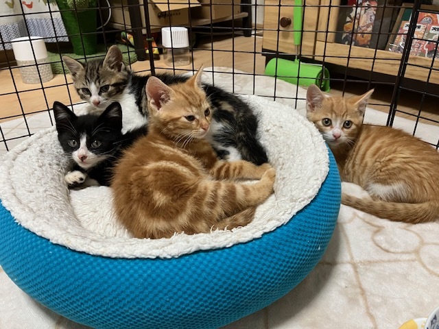 | 特徴(性格など) | 左から ①チャトラ白 ②白黒八割れ ③キジトラ白(アメショ柄) ④チャトラ(アメショ柄) 4匹ともオスです。 |