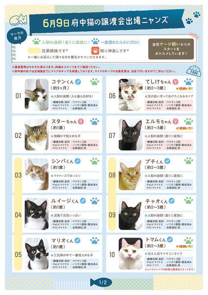 | その他(譲渡条件など) | ୨୧⌒⌒⌒⌒⌒⌒⌒⌒⌒⌒⌒⌒⌒⌒⌒୨୧ 府中駅直結⭐︎譲渡会のお知らせ ୨୧⌒⌒⌒⌒⌒⌒⌒⌒⌒⌒⌒⌒⌒⌒⌒୨୧ 【日時】6月9日(日)13時〜15時半まで 【場所】LIGHT UP LOBBY (下記のリンクに詳細あり) ※事前に整理券を配布。ご予約は必要ありません。 https://chuneko.exblog.jp/32603337/ ※会場への直接のお問い合わせはお控えください。 ご質問はfuchu_nekonokai@yahoo.co.jpまで こんにちは。『NPO法人府中猫の会』です。 地元のTNR活動&保護活動(野良猫を増やさない取り組みや行き場のない猫達の保護)に尽力しているボランティア団体です。 その他にも、当ボランティアの取り組み『熊本市殺処分STOPプロジェクト』として、139匹の保護猫達を熊本から東京に空輸して参りました。 今回ご披露する猫ちゃん達は、くまっ子空輸にゃんずの他、飼い主から飼育放棄されてしまった捨て猫や強制執行で夜逃げされた猫達など、どの子達もみんな行き場のない子達ばかりを保護し、育て上げた子達が参加します。 今回出場する子達は全匹お留守番OKなのでお仕事をフルタイムでお持ちのご家庭でも問題なく迎えていただけます。 自信を持って、この度もかわいい子ども達をご紹介させていただきます! 活動内容や保護猫達の様子が気になる方は、ぜひ!YouTubeちゅー猫チャンネルをご視聴ください。 ↓↓↓ ฅ^•ﻌ•^ฅ♡ちゅー猫チャンネル https://youtube.com/@chuneko ◆成猫さんだけ参加予定の譲渡会。 ◆血液検査、ワクチン2回接種、マイクロチップ装着、全ての医療を終えております。ご安心ください。 【 よくあるご質問 】 ◆猫を飼いたい。でも保護猫ってハードルが高い気がする… その点はご安心ください。出場する全ての猫達はみんな家猫訓練を受けており、トイレ訓練もパーフェクトな猫達です。 猫飼い初心者OKな猫ちゃんも多数出場します。 ◆60歳を超えているが、猫を迎えたい。 今時の60代様、70代様は、大変お若くアグレッシブでいらっしゃいます! そんな方々にはぜひ!成猫さんをオススメさせていただきます。 今回出場する成猫さんは、捨てられた子達ばかりです。(多頭崩壊、飼育放棄、夜逃げによる強制執行) みんな心に傷を負っている子達を保護しております。しばらく心のケアや家猫訓練をバスした子達を出場させますので、ぜひ!会いに来てください。 ※60歳以上の方は後継人をお願いしております。後継人の方とご来場いただくと私達も選考しやすいのでよろしくお願いします。 ◆わが子の為にも保護猫を迎えたい!しかし、私達家族一同、猫を飼うのは初めてです。どうしたらいいですか? そのようなご家庭こそぜひ!お待ちしております! 猫ちゃんの魅力を知っていただきたいのと、お子様が保護猫達と一緒に育つ事により『命に優しい情操教育』となると願っている当会です。 喜んでお待ちしております。 ※猫アレルギー問題があります。初めて猫を飼う方は猫アレルギー検査を事前にしていただくと私達も選考しやすいです。 特にお子様には必ず検査をお願いします。 ◆仕事があって、お留守番をさせるのが心配… ご心配はご無用です! 今回出場する子達はみんな成猫さんなので、一日フルタイムでお仕事をお持ちのご家庭でも問題なく迎えていただける子達ばかりです。 【 譲渡会にご参加くださる方々へ 】 ₍ᐞ•༝•ᐞ₎◞ ̑̑ ◎混雑を防ぐ為、入場制限をさせていただきますが、ご予約の必要はございません。 入り口カウンターにてスタッフが整理券を配布いたしますのでご協力お願い申し上げます。 ₍ᐞ•༝•ᐞ₎◞ ̑̑ ◎初めて猫ちゃんを迎える方(特にお子様のいるご家庭)は、猫アレルギーの有無を明確にしてくださると選考しやすいです。 ₍ᐞ•༝•ᐞ₎◞ ̑̑ ◎譲渡会はお見合いのみの場となっております。 ご来場前に必ず下記の事項をご参照ください。 ▶︎譲渡会のシステムについて◀︎ https://chuneko.exblog.jp/32604872/ 【見学希望やご支援者の方々へ】 ₍ᐞ•༝•ᐞ₎◞ ̑̑ いつもありがとうございます♡ 会場はホテルのカフェとなっております。 お飲み物をご注文くださればお席にご案内いたします。(入口スタッフに一言お申し出ください。) 大変申し訳ないのですが、里親希望の方々を優先的にご案内させていただくのをご了承の上、お越し下されば幸いです。 会場では、ちゅー猫オリジナルグッズも販売しております。 |