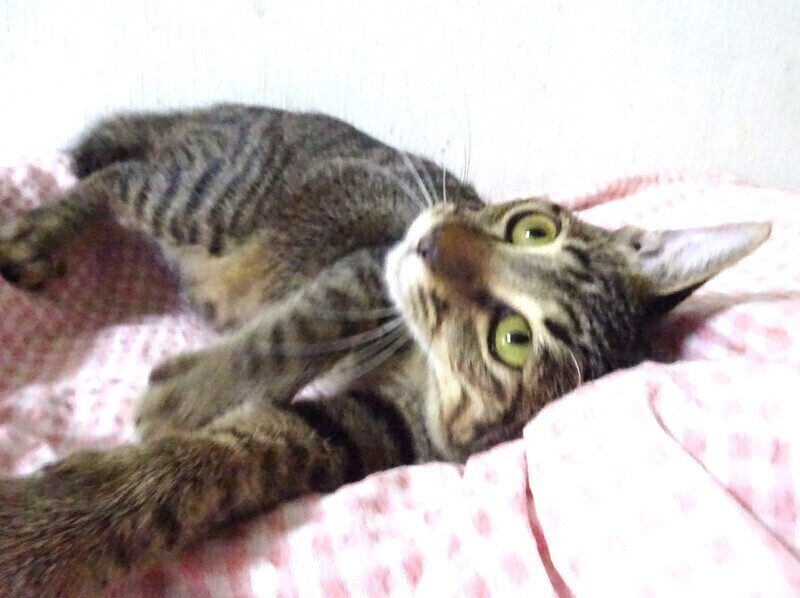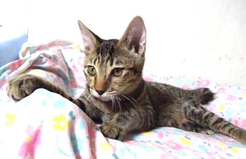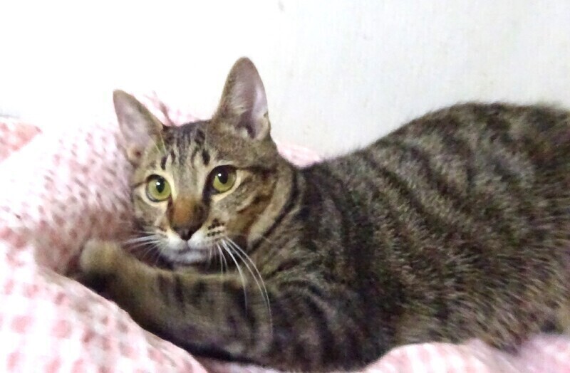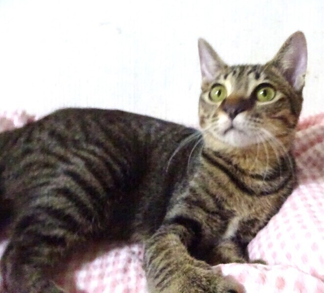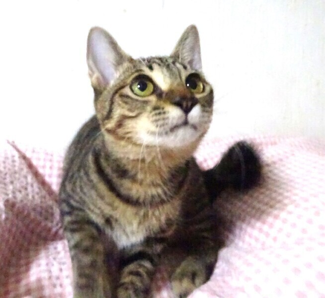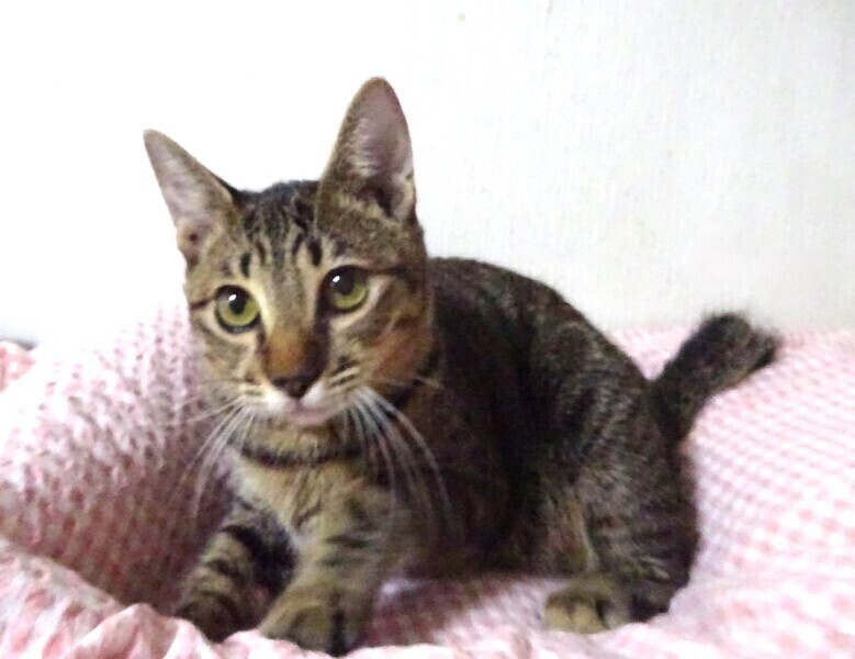 | 特徴(性格など) | 仮名: 翔(しょう)くん、オス 毛色: キジトラ、尻尾短い 性格: 人は好きみたいで威嚇なく、ケージに近づくとすぐに寄ってきます。 抱っこも好きですが、兄弟の中で翔君だけがケージの6センチの隙間から脱走する事を覚え、脱走マニアになっています。 今は大きくなりさずがにすり抜けられませんが、ケージを開けると上に登ってでたり、腕をつたってでたりします。 ご飯大好きでよく食べますが少食のほうですし、大柄ではありません。 ケージをあけるとスリスリして、そのうち腕を登って肩にあがります。 ケージから出る事にはよく頭を使うようです。男の子なので活発に遊びますし、歩いていると足元にスリスリ、たまにタックルして遊んでいます。 じゃらしに燃えます。 お届けは千葉県内で、車で1時間位でお願いします。 検便済 駆虫済 3種混合ワクチン済 去勢手術済 猫エイズ・白血病ウィルス検査は共に陰性です |