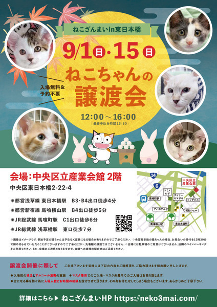 | その他(譲渡条件など) | 11:30より、2階会場入口にて受付を開始します。 受付時に入場予定時間が記入された整理券をお配り致しますので、整理券を受け取った方はお時間になりましたら2階会場入口に番号順にお並び下さい。 ※11:30より早くいらしてもお待ちいただく場所がございません。 また、近隣にお住まいの方や他階フロアのご利用者様にご迷惑となる場合がございますので、受付開始時間にあわせてお越しくださいますよう、何卒ご協力お願いいたします。 ※ねこざんまい譲渡会は、先着順で里親様を決定する譲渡会ではありません。 先に申し込みをした方を優先することもありません。 お話をして、その猫ちゃんに合ったおうちに決めさせていただいております。 12時に開場し、里親様の決定は14時以降となります。 14時以降にご入場の場合、希望の猫ちゃんが決定している可能性があります。 また1頭に対し多数のご希望をいただいた場合、早めに申し込みを締め切らせていただく場合がございますので、予めご了承下さい。 里親様決定は14時以降となります。 その後、迎え入れ準備の説明等のお時間も頂戴しますので、お時間に余裕を持ってご来場下さい。 【新型コロナウィルス感染予防対策について】 譲渡会開催に際し、ご来場下さいます皆様には以下の内容をご理解頂き、ご協力頂けます様お願い申し上げます。 ●入場前の検温とアルコール消毒の実施 ●マスク着用でのご入場=マスク未着用でのご入場はお断り致します ●入場人数の制限をさせていただきます(来場多数の場合は入れ替え制となります) ●時間と人数の制限=密になる事を防ぐ為に入場人数とお時間の制限を設けさせて頂きます その為お待たせしてしまう場合もございます ●会場利用規約により、ご来場者様の連絡先を控えさせていただきます あらかじめご了承下さい。 諸々の制限がございますが、安心・安全な譲渡会運営のためにご理解・ご協力いただきますようお願い申し上げます。 ~~~~~~~~~~~~~~~~~~~~~~~~~~~~~~ ★仔猫ご希望の里親様★ 仔猫ちゃんたちは、まだ体がしっかりしていない赤ちゃんです。 下痢だけでも数時間対応ができなかっただけ死に至る事もあります。 その為、月齢に応じたお留守番時間を設けさせていただいております。 また、子猫ちゃん(6ヶ月未満)の里親様には子猫支援金のご協力をお願い致しております。 ★猫ちゃんとのお見合いは譲渡会で!★ ねこざんまいの猫ちゃんは譲渡会でのお見合いのみとなります。 『この子はいつ譲渡会に参加するの?』『譲渡会場の場所はどこ?』などは、ねこざんまいホームページをご覧ください。 https://neko3mai.com/ ★楽しく猫ちゃんと触れ合って★ ねこざんまい譲渡会は、猫ちゃんも里親様も保護主も笑顔で過ごせる譲渡会を目指しています。 これから20年以上、楽しい時も、悲しい時もいつも傍にいてくれる大切な家族になる猫ちゃんです。 会場には沢山の猫ちゃんがいます。 1匹1匹、触れ合って猫ちゃんとお話してください。 『初めて猫ちゃんを家族に迎える方』 『先住猫ちゃんのお友達を迎える方』など トライアルの仕方や先住猫ちゃんと仲良くなるコツなど経験豊富な保護主やスタッフにお気軽にご相談ください! 猫を愛し、そして猫に愛されている猫好きスタッフと保護主がアドバイスさせていただきます。 ★里親希望のみなさまへ★ ペットではなく、家族一員としてたっぷり愛情を注いでくださるご家庭をお待ちしております。 恐れ入りますが ●学生の方、子猫・幼猫希望の60才以上の方のみのご家庭 ●脱走防止対策にご協力いただけない方 は原則譲渡を遠慮させていただいております。 ●一人暮らし・同棲(事実婚)の方 保護主の希望や猫の年齢・性格等により、ご希望に添えない場合もございます。 参加猫ちゃんは、それぞれ保護主(実際に猫ちゃんを自宅に入れ、保護をしている方)が異なります。 詳しい条件なども異なる場合がございますので、会場内で直接保護主とお話ください。 〖共通条件〗 1.終生飼育 2.完全室内飼い 3.脱走防止対策へのご協力 4.避妊去勢手術 5.契約書類へのサイン 6.定期報告 7.医療費等の負担 当日の猫ちゃんを連れて帰ることはできません。後日、保護主が里親様のご自宅までお届け致します。 その為、移動の際の猫ちゃんの負担を月齢などから考慮し、お届け地区を限定させて頂くこともございますのでご了承ください。 ご理解とご協力のほど宜しくお願い致します。 ☆よくある質問☆ ・譲渡の条件 ・ご負担頂く費用 ・譲渡会の場所等は ホームページに詳しく掲載させて頂いておりますのでご覧ください。 https://neko3mai.com/ メールでのお問い合わせはすぐにご返答出来ない場合がございますのでご了承ください。 ホームページ https://neko3mai.com/ お問い合わせ http://www.neko3mai.com/contact/form_general.html ねこざんまいブログ http://ameblo.jp/neko3mai/ |