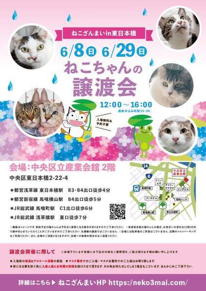 | その他(譲渡条件など) | 11:30より、2階会場入口にて受付を開始します。 受付時に入場予定時間が記入された整理券をお配り致しますので、整理券を受け取った方はお時間になりましたら2階会場入口に番号順にお並び下さい。 ※11:30より早くいらしてもお待ちいただく場所がございません。 また、近隣にお住まいの方や他階フロアのご利用者様にご迷惑となる場合がございますので、受付開始時間にあわせてお越しくださいますよう、何卒ご協力お願いいたします。 ※ねこざんまい譲渡会は、先着順で里親様を決定する譲渡会ではありません。 先に申し込みをした方を優先することもありません。 お話をして、その猫ちゃんに合ったおうちに決めさせていただいております。 12時に開場し、里親様の決定は14時以降となります。 14時以降にご入場の場合、希望の猫ちゃんが決定している可能性があります。 また1頭に対し多数のご希望をいただいた場合、早めに申し込みを締め切らせていただく場合がございますので、予めご了承下さい。 里親様決定は14時以降となります。 その後、迎え入れ準備の説明等のお時間も頂戴しますので、お時間に余裕を持ってご来場下さい。 【新型コロナウィルス感染予防対策について】 譲渡会開催に際し、ご来場下さいます皆様には以下の内容をご理解頂き、ご協力頂けます様お願い申し上げます。 ●入場前の検温とアルコール消毒の実施 ●マスク着用でのご入場=マスク未着用でのご入場はお断り致します ●入場人数の制限をさせていただきます(来場多数の場合は入れ替え制となります) ●時間と人数の制限=密になる事を防ぐ為に入場人数とお時間の制限を設けさせて頂きます その為お待たせしてしまう場合もございます ●会場利用規約により、ご来場者様の連絡先を控えさせていただきます あらかじめご了承下さい。 諸々の制限がございますが、安心・安全な譲渡会運営のためにご理解・ご協力いただきますようお願い申し上げます。 ~~~~~~~~~~~~~~~~~~~~~~~~~~~~~~ ★仔猫ご希望の里親様★ 仔猫ちゃんたちは、まだ体がしっかりしていない赤ちゃんです。 下痢だけでも数時間対応ができなかっただけ死に至る事もあります。 その為、月齢に応じたお留守番時間を設けさせていただいております。 また、子猫ちゃん(6ヶ月未満)の里親様には子猫支援金のご協力をお願い致しております。 ★猫ちゃんとのお見合いは譲渡会で!★ ねこざんまいの猫ちゃんは譲渡会でのお見合いのみとなります。 『この子はいつ譲渡会に参加するの?』『譲渡会場の場所はどこ?』などは、ねこざんまいホームページをご覧ください。 https://neko3mai.com/ ★楽しく猫ちゃんと触れ合って★ ねこざんまい譲渡会は、猫ちゃんも里親様も保護主も笑顔で過ごせる譲渡会を目指しています。 これから20年以上、楽しい時も、悲しい時もいつも傍にいてくれる大切な家族になる猫ちゃんです。 会場には沢山の猫ちゃんがいます。 1匹1匹、触れ合って猫ちゃんとお話してください。 『初めて猫ちゃんを家族に迎える方』 『先住猫ちゃんのお友達を迎える方』など トライアルの仕方や先住猫ちゃんと仲良くなるコツなど経験豊富な保護主やスタッフにお気軽にご相談ください! 猫を愛し、そして猫に愛されている猫好きスタッフと保護主がアドバイスさせていただきます。 ★里親希望のみなさまへ★ ペットではなく、家族一員としてたっぷり愛情を注いでくださるご家庭をお待ちしております。 恐れ入りますが ●学生の方、子猫・幼猫希望の60才以上の方のみのご家庭 ●脱走防止対策にご協力いただけない方 は原則譲渡を遠慮させていただいております。 ●一人暮らし・同棲(事実婚)の方 保護主の希望や猫の年齢・性格等により、ご希望に添えない場合もございます。 参加猫ちゃんは、それぞれ保護主(実際に猫ちゃんを自宅に入れ、保護をしている方)が異なります。 詳しい条件なども異なる場合がございますので、会場内で直接保護主とお話ください。 〖共通条件〗 1.終生飼育 2.完全室内飼い 3.脱走防止対策へのご協力 4.避妊去勢手術 5.契約書類へのサイン 6.定期報告 7.医療費等の負担 当日の猫ちゃんを連れて帰ることはできません。後日、保護主が里親様のご自宅までお届け致します。 その為、移動の際の猫ちゃんの負担を月齢などから考慮し、お届け地区を限定させて頂くこともございますのでご了承ください。 ご理解とご協力のほど宜しくお願い致します。 ☆よくある質問☆ ・譲渡の条件 ・ご負担頂く費用 ・譲渡会の場所等は ホームページに詳しく掲載させて頂いておりますのでご覧ください。 https://neko3mai.com/ メールでのお問い合わせはすぐにご返答出来ない場合がございますのでご了承ください。 ホームページ https://neko3mai.com/ お問い合わせ http://www.neko3mai.com/contact/form_general.html ねこざんまいブログ http://ameblo.jp/neko3mai/ |