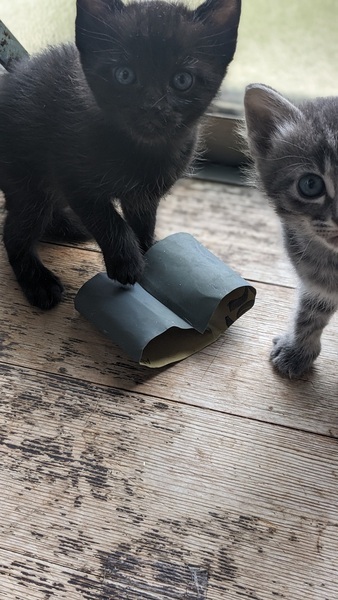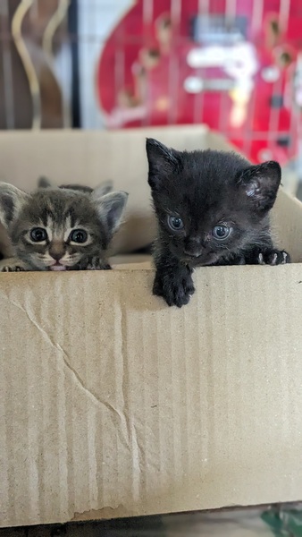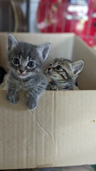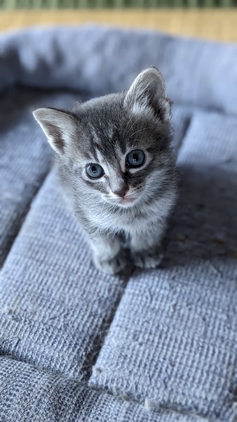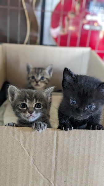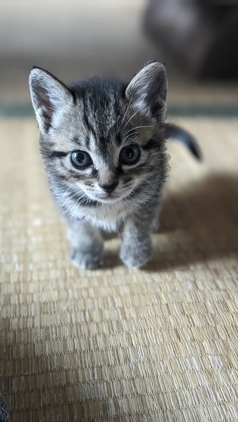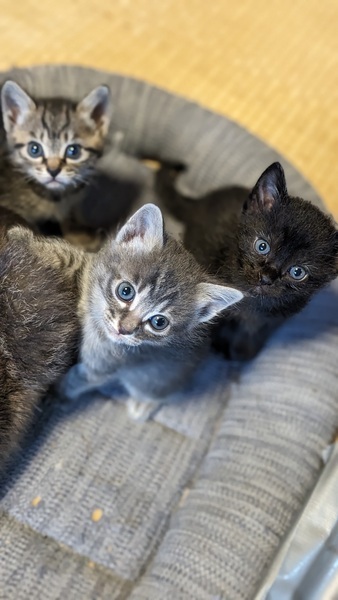| 特徴(性格など) | グレー(オス)・少し茶色掛ったキジトラ(メス)・黒(オス)の三匹です。とても大人しく無駄鳴きしません。3日くらい前にオスたちが離乳しました。メスは昨日から猫缶を食べるようになりました。母猫がいるので、お乳を飲んでいました。いまでも飲みます。まだ完全離乳ではありませんが、1ヶ月以上経ちましたので、そろそろ引き渡し可能かと思います。黒い子だけ、しっぽの先が少し曲がっています。どの子も目が大きくてきれいです。 | ||