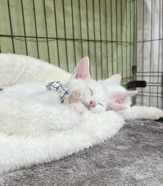 | 特徴(性格など) | 間もなく生後2ヶ月くらいになる泣きべそ顔の白猫ちゃんです。 仮の名前をこしろと呼んでいます。 こしろの可愛いポイントは、遊び方の強弱ができるところです。 よく遊びよく食べ、オモチャにもすぐ興味を持つのでひとり遊びもしますし、一緒に遊んだりもできて楽しいです。毎日元気いっぱいですが、抱っこをするとじっと抱っこさせてくれ愛らしさ満点です。 ワンパク過ぎず、元気でかわいらしいので初心者の方でもトライしやすい子です。 |