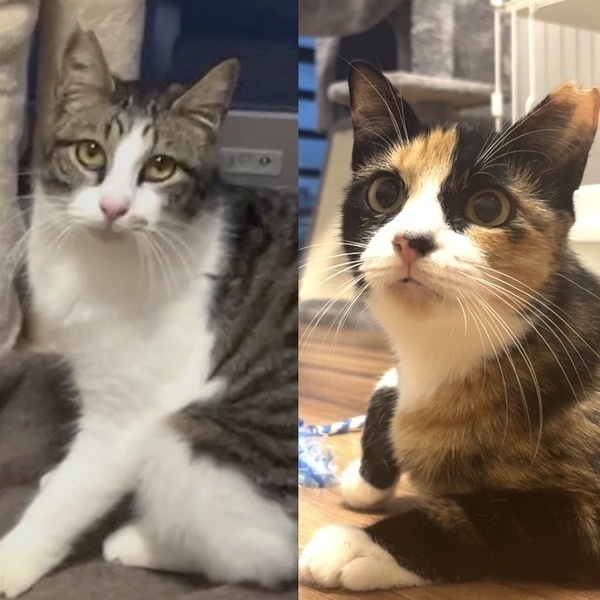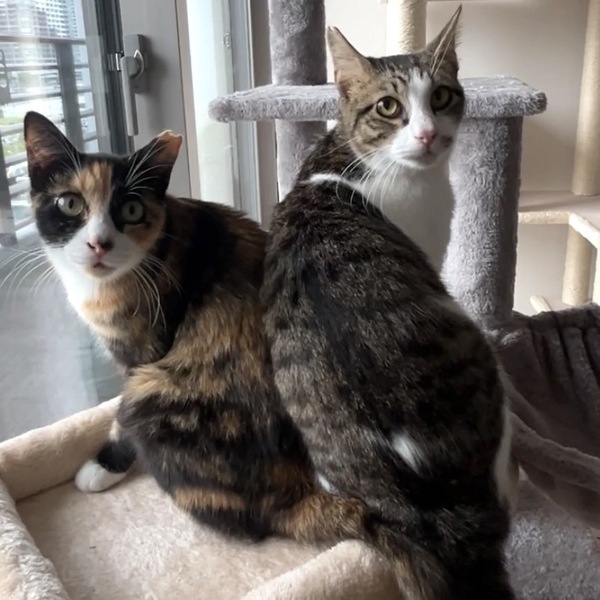 | 特徴(性格など) | ※2匹ペアでの譲渡になります。 ◎オリオン(キジ白)オス ◎ちゅら(黒三毛)メス 沖縄出身の仲良し兄妹、兄と妹で性格が違いバランスの良いペアです。 2匹とも人慣れしていてナデナデも好きですが、ベッタリというわけではなく程良く甘えん坊です。 日中は寝ていることが多く2匹でも遊んでくれるので、お留守番も大丈夫です。 ◎オリオン:マイペース・慎重派・穏やかな兄 最初は臆病で部屋の中をうろうろしたりしますが、慣れると甘えん坊。ニャーと寄ってきて撫でて欲しがったりもします。 おもちゃで遊ぶのも好きですが、ちゅらちゃんの勢いには押され気味。お外を見てのんびり過ごすのが好きなようです。 繊細なところがあり隠れてしまったり、時には妹に甘えたり、強そうな見た目と性格のギャップが可愛いです。 ◎ちゅら:天真爛漫・甘えん坊・ちゃっかり者の妹 基本は人の近くにいたいようで、人の後をついて回ることもあります。 すぐお腹を出す甘えん坊ですが、ヤキモチを妬いたりなどもせず自立したところもある飼いやすい子だと思います。 おもちゃ遊びが大好きで一緒にも一人でも遊びます。 兄より小柄なのに自分からニャンプロを仕掛けたり、兄の分もおやつを食べちゃったり、ちょっぴり笑える妹らしい性格です。 ※2匹とも食の好みがあり、ウェットフードやおやつは種類や時間帯によって食べないことがあります ※ちゅらちゃんはひも系のものや綿を食いちぎろうとするのでオモチャは都度しまうなど注意してください ※最初キャットタワーの中綿を出してしまったりしたので木製のものの方が良さそうです 環境に慣れるとそういった行動は落ち着きました ★預かり宅での様子はInstagramでご覧いただけます https://www.instagram.com/neko_to_ohana/ ★YouTubeみなとねこチャンネルでも紹介動画をご覧いただけます https://youtu.be/J0ht67pwBZY?si=N9rzirO7E1c884h_ ●健康状態 とても健康で元気です 避妊手術済み ウイルス検査(エイズ・白血病)陰性 ワクチン 駆虫 検便 シャンプー 爪切り |