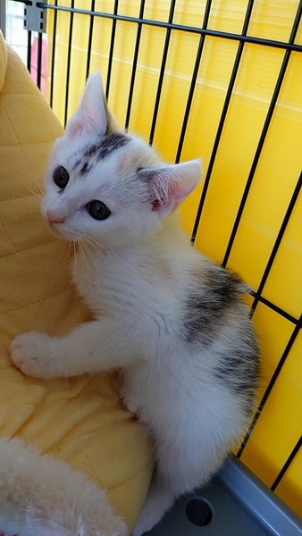 | 特徴(性格など) | 珍しい白多めのパステル三毛猫ちゃん 性格は大人しめ 姉妹のシマミケちゃんてあ毎日ワチャワチャしてます |