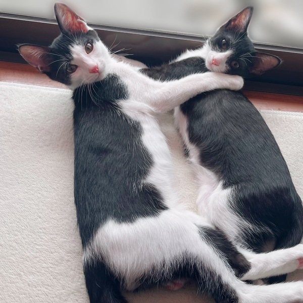 | 特徴(性格など) | ※2匹ペアでの譲渡になります。 人間がミルクで育てたとても素直な甘えん坊兄妹です。 名前は、シナモロールから決めました。 ◎シナモン(白多め♂) ◎モカ(オーソドックスなハチワレ♀) ご飯もカリカリ、ウェットどちらもよく食べ、お水もたくさん飲んでいます。 一緒に仲良く寝て、遊ぶ時も2匹で走り回っています。 少しずつ性格の違いも見えてきました。 ・シナモンは男の子なので少し大きいですがゆっくりめなので女の子2匹におもちゃを取られて後ろで見てることがあります。でも1番遊びたくて追いかけ回しています。 ・モカは少しびびりで初日は隅っこに隠れていましたが、翌日にはだいぶ慣れてくれてずっと遊んでいました。 |