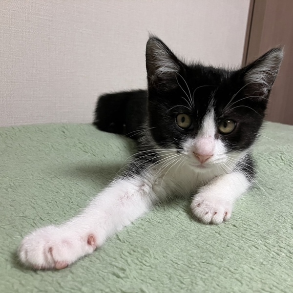 | 特徴(性格など) | 【仮名】もみじちゃん 【性格】シンメトリーハチワレなもみじちゃん♪ おててもキレイにシンメトリー(笑) チョット人見知りなトコはありますが ハチワレながらの天真爛漫さで なにごとも積極的に学習中です♪ 最近ではゴロゴロも覚えて おウチにゃんこまであと一歩です♪ 兄妹とにゃんプロして良く寝てよく食べ スクスクと成長中のハナマルにゃんこ♪ ともに過ごしている兄妹や同世代チビと 一緒のお迎えをお願いしたいと思います♪ ※1ピキ譲渡不可 |