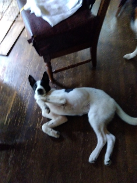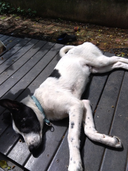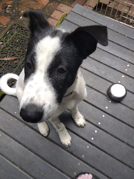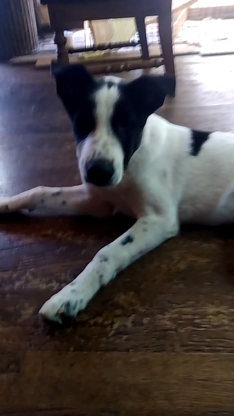 | 特徴(性格など) | 性格は明朗活発で、とっても元気です。 顔は白黒のはち割れで、体は白地に大きな黒いスポットが一か所あり、あとは小さな黒い点々が散っています。顔が小さく、足が長く、猟犬のような体形をしています。耳は半立ちです。 母親はボーダーコリーのようです。 成犬になると15キロ以上になると思われます。ただミックス犬なのでサイズに関しては、確実ではない事をご理解ください。 |