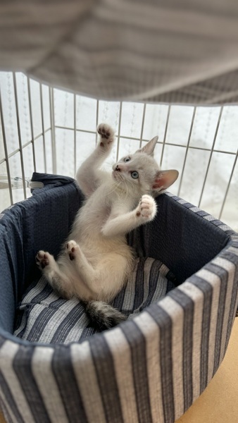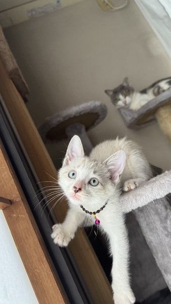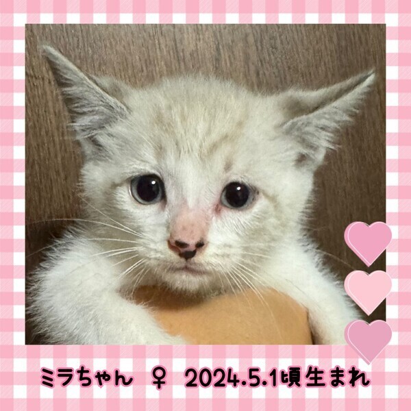 | 特徴(性格など) | ♡.*・。┈┈┈┈┈┈┈。・*.♡ 名前 ミラ 種類 雑種 色 白×グレー 年齢 推定2024/5/1頃 性別 メス 体重 850g(子猫の体重は日々変化します) ♡.*・。┈┈┈┈┈┈┈。・*.♡ ワクチン 3種混合接種済(1回目) フィラリア 今年生まれなので6月より予防薬をしております。 マイクロチップ 装着済 避妊去勢手術 未 メディカルチェック 聴診触診、検便、異常なし。 駆虫薬投与、ノミダニ駆除済。 FIV、FeLV共に陰性。 ♡.*・。┈┈┈┈┈┈┈。・*.♡ 少し怖がりで慎重派タイプです。 兄妹猫のレオくんの動きを見ながら、大丈夫と安心しているようなところがあります。 最初は警戒していましたが、最近は人にも馴れて触るとすぐ喉を鳴らし、眠い時は人の横に来てくっついて寝てくれたりします。 よく食べて兄妹とニャンプロして、元気いっぱいに過ごしています。 兄妹猫のレオくんと仲良しなので、出来れば2匹で同じお家に行けるのが、1番理想的と考えています。 日常の様子はInstagramでご覧ください。 https://instagram.com/linkplus_wan.nyan?igshid=YmMyMTA2M2Y= |