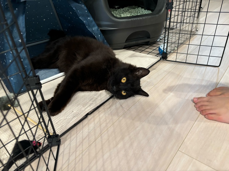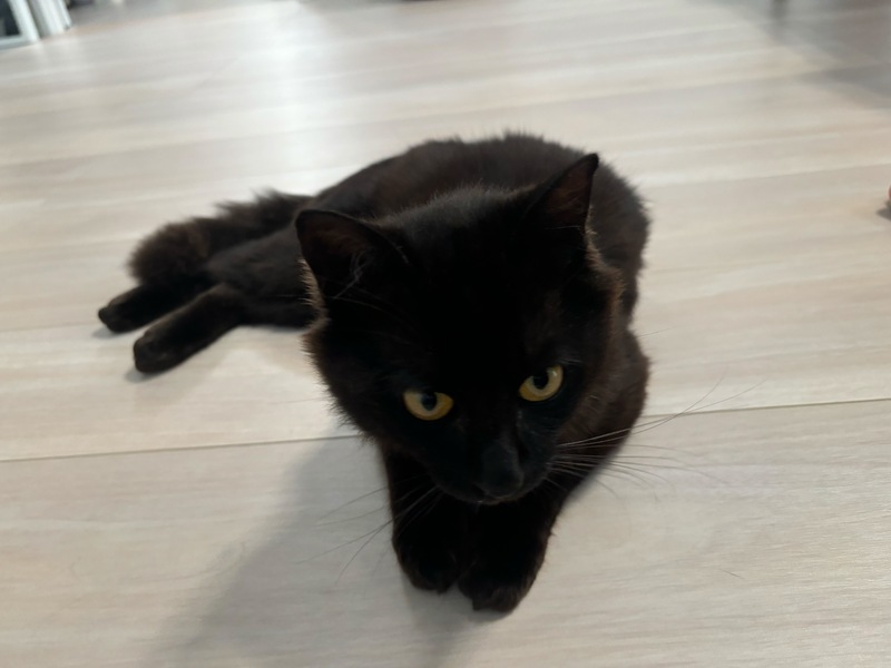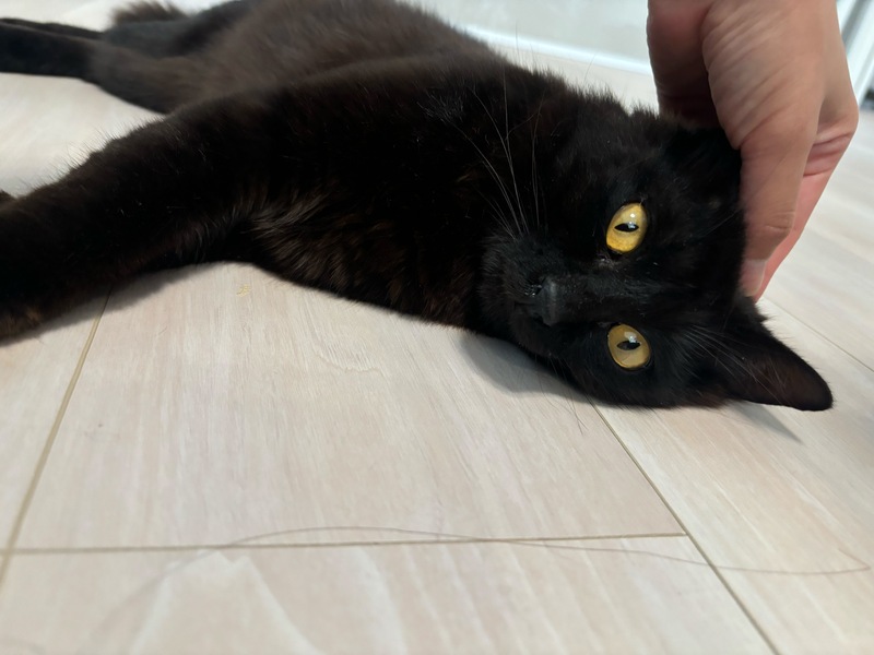 | 特徴(性格など) | 黒猫のオスで、しっぽがフサフサのやや長毛さんです。 雑種だと思います。 美猫(イケメン)だと思います。 すごく甘えん坊で、警戒心ゼロでした。おしゃべりも沢山します。後をついてまわるほどの甘えん坊です。 お外で初めて会った日から、近寄ってきて撫でてほしいという感じでした。 間違いシャーみたいなものはありましたが、威嚇などもしませんでした。 足先をしつこく触るのを嫌がるようですが、基本、それ以外(おなかやしっぽなど)はおさわりOKみたいです。 今では、歩いているとついてきて、足にスリスリしてきます。 |