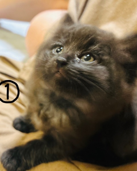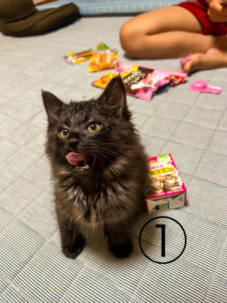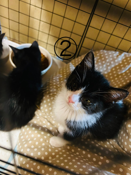 | 特徴(性格など) | ①黒(グレーに近い)オス:人懐っこい甘えん坊。元気に遊びます。短シッポ。毛長。 ②白黒オス:人懐っこい。鍵シッポ。元気です。 ③黒メス:小柄ですが元気です。鍵シッポ。 |