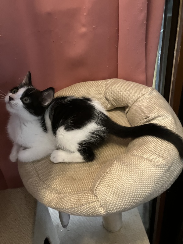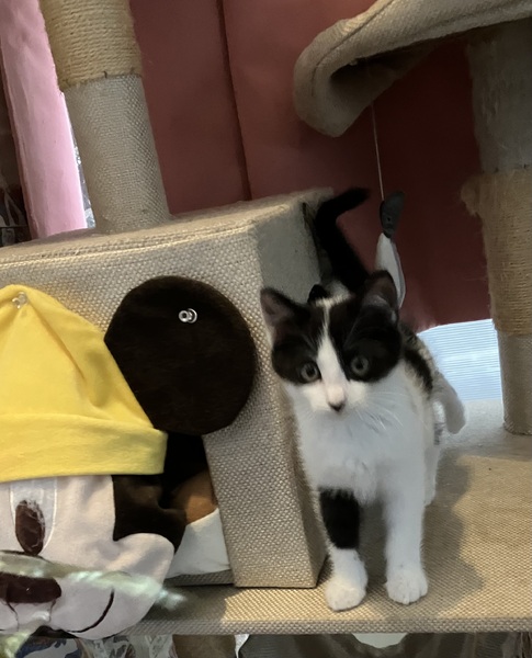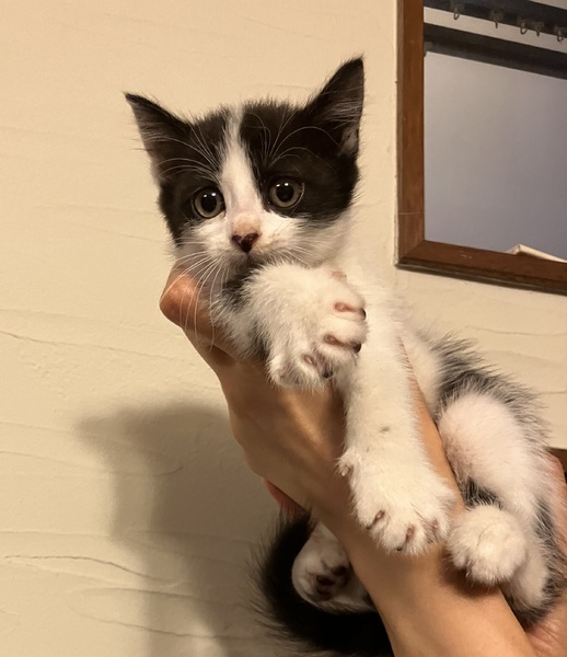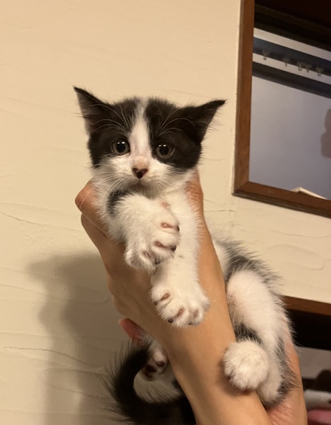 | 特徴(性格など) | 綺麗な黒白ハチワレ子猫です。尻尾は長くて真っ直ぐです。お鼻にはハートマークあり、背中にもハートマークあります。穏やかでおもちゃで遊ぶのが大好きです。 猫ちゃんのお友達にも1匹で飼われても、お留守番も出来ます。 |