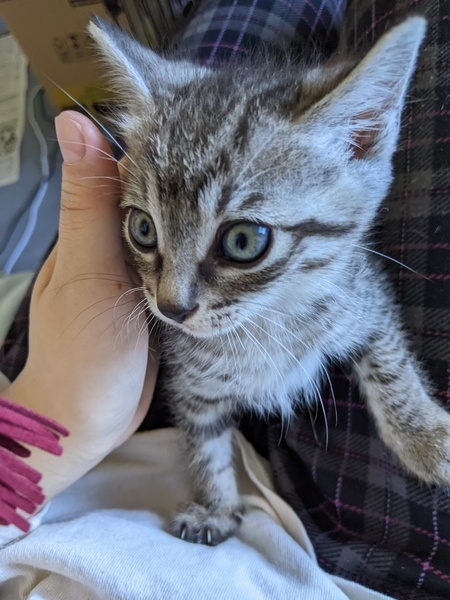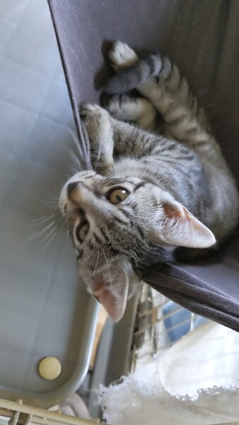 | 特徴(性格など) | 【色柄】サバトラ柄の子猫です。目の縁の柄がチャームポイントです! 【性格】おとなしい性格で、ケージの隅のほうで落ち着いていることが多いです。体が小さくて、かくれんぼが上手い子です。 |