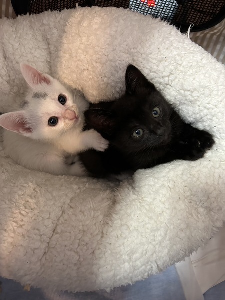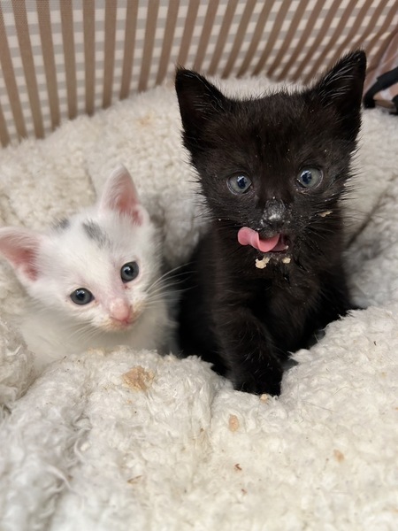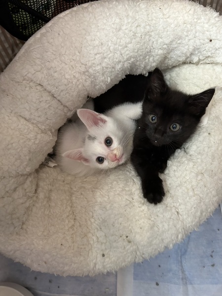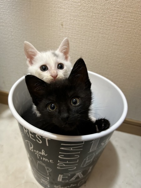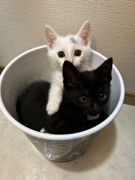 | 特徴(性格など) | ●猫の種類 : 雑種 黒猫と白猫 ●猫の年齢:生後1ヶ月 ●保護している場所:福岡市南区 ●性格・特徴: 黒猫♀:わーちゃん ツキノワグマのような顎下に白がチャームポイントの女の子です。 食いしん坊で甘えん坊すぐにゴロゴロ言います。 白猫♂:じゅうじゅう 頭に墨汁を垂らしたような黒がチャームポイントでやんちゃでかわいい男の子です。 仲良し2匹なんで是非2匹一緒に貰って頂けると幸いです。 ●現在の健康状態:健康状態良好、食欲旺盛 ノミダニお腹の虫下し、エイズ白血病陰性です。 ワクチン接種予定 |
