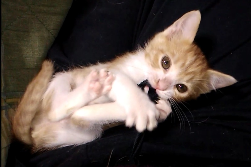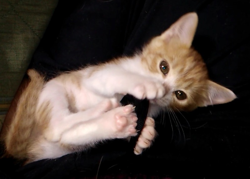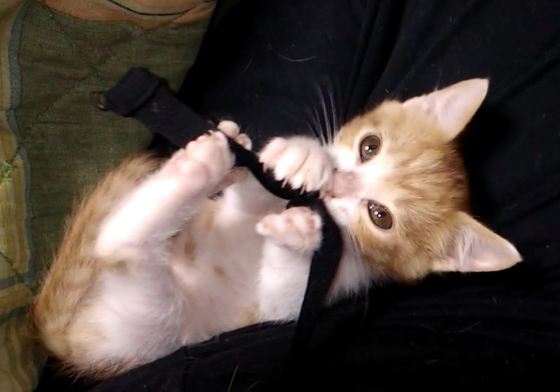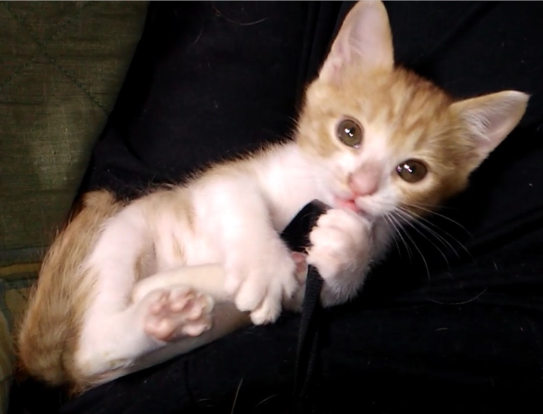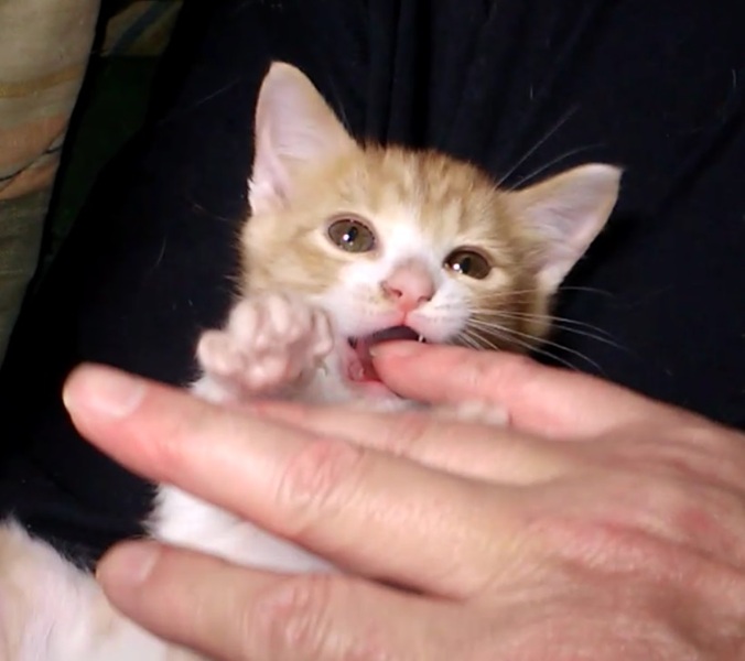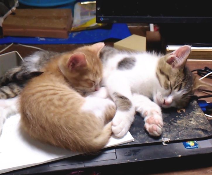 | 特徴(性格など) | 保護した時は発育不良でほとんど寝てばかりでしたが、食欲が出てきて元気になり、とてもやんちゃになりました。 今年の春子猫を12匹保護しましたが、病弱なこの子とキジBくんは、私の部屋で寝泊まりしていました。 一緒の部屋で寝泊まりしたので、とても良くなついています。 またキジBくんととても仲良くなり、いつも一緒に遊んでいます。 最近、少し生意気になりました。勇敢で、一回り大きいキジBくんにも飛びかかっていきます。 |