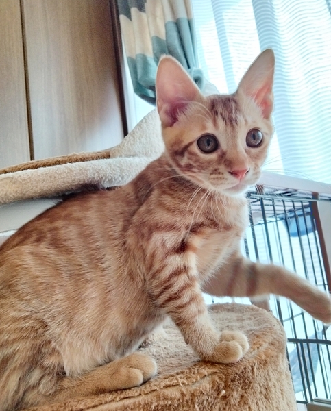 | 特徴(性格など) | 茶トラ男の子2匹のうち、まっすぐ長いしっぽがちい太くんです 保護した生後4週くらいから人の手でミルクをあげているので、三兄妹とも人慣れはばっちりです! ずっと3匹で遊びながら成長しているので社会性もしっかりついていて、人見知り、猫見知りしません 誰にでもフレンドリーな子たちなので、最初の1匹目にもおすすめです 兄妹一緒のお迎えも大歓迎です! ちい太くんは、とにかくよく食べてよく遊ぶ元気一杯の男の子 高速で床を動かす猫じゃらしを追っかける遊びが大好きです たくさん遊んであげられるお家、若い先住さんがいるお家におすすめです! ・トイレしつけ済 ・ノミ・ダニ駆除済 ・検便、駆虫済 ・ワクチン接種2回済 ・猫免疫不全ウイルス陰性 ・猫白血病ウイルス陰性 ・3匹とも保護時にケガはなく、健康状態は良好です ご質問は何でもお気軽にどうぞ! |