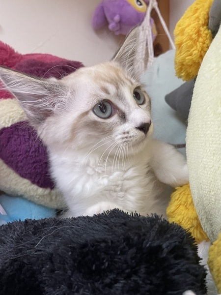 | 特徴(性格など) | クリーム色というか、シャム色の美しい女の子。フワフワで手触りが良く撫でると気持ちが良いです。 生後3ヶ月くらいになるまでお外で暮らしていたので それなりに人見知りしています。 が、猫じゃらしで一緒に遊ぶようになったり 触っても怒らなくなったり 日々 着実に慣れていってます。 警戒心強めですが、心を許してくれたら甘えん坊さんになりそうです。 保護日 6/25 5兄妹です。 トイレ◎ 人慣れ訓練中(噛んだり引っ掻いたりは無いです) ノミ駆除、駆虫薬投薬済み ウイルス検査 FIV,FeLV 共に陰性 |
