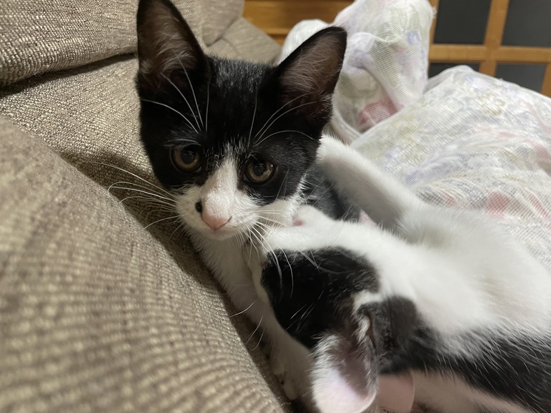 | 特徴(性格など) | 性格はとてもおっとりとしていて よく慣れておりゴロゴロスリスリの可愛い女の子です 鼻に鼻くそのような黒い点の柄がトレードマーク 毛並みもツルツルで手触りがすごくいい子です 体がふにゃふにゃととても柔らかく これもまた気持ちいい感触です |
