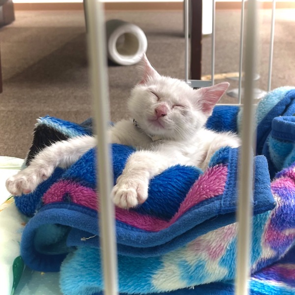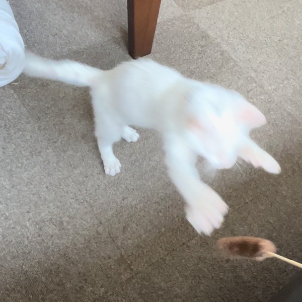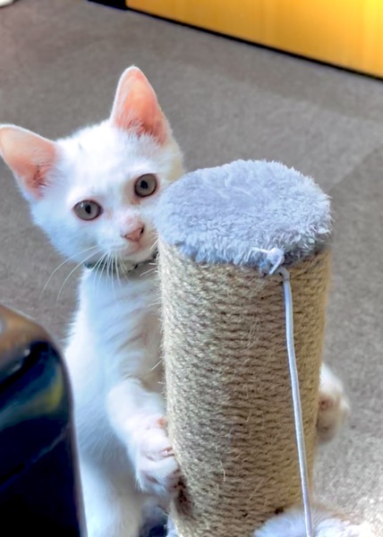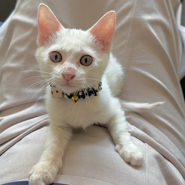 | 特徴(性格など) | 白い毛並みで頭にうっすら黒の模様があります。 目は綺麗な深緑色 人懐っこく、部屋に入ると足元にすり寄ってきてくれます。 普段は会社で保護しているので、一人遊びをしてくれています。 紐が好きで、すぐにおしりをフリフリ!とびかかってきます。 だっこが好きなようで、抱えたままうろうろすると興味津々 最近ジャンプにハマっていてびよーんと飛びます。 また、じゃれる延長で噛み始めたため、おもちゃで遊べるよう練習中です。 トイレは保護時点ですでにできており 特にトレーニングせずとも粗相をしていない賢い子です。 おなかの虫の検査は陰性 ノミダニの駆除済(元々おりませんでした) 月齢が幼いため、エイズ検査・避妊はまだおこなっておりません。 皮膚病を患っており現在治療中のためお譲りは9月以降を予定しております。 |