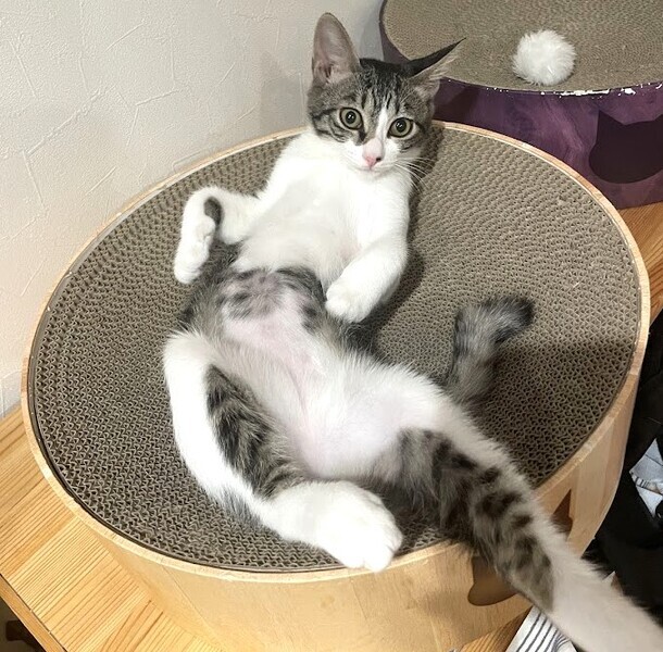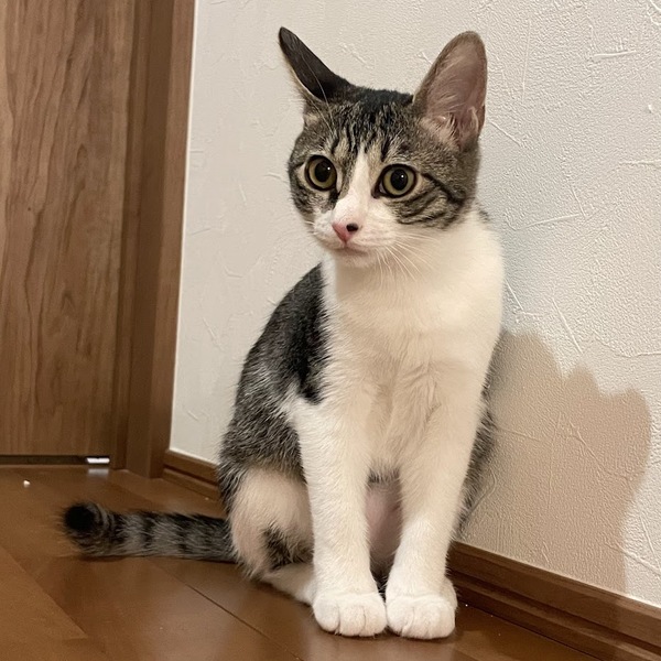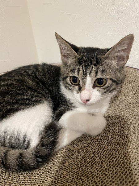 | 特徴(性格など) | 最初は警戒心がありましたが、今ではすっかり慣れてくれて、撫でるとゴロゴロ、向こうからジャンピングですりすりしてきてくるようになりました。お尻ぽんぽんが大好きです。どんどん甘えたになっていくと思います。ケージは使っておらず、家の中でフリーで過ごしています。猫も人も好き。猫同士のコミュニケーション能力が高く、先住猫優先で、遠慮がちにごはん食べます。とても賢い子で、我が家の先住猫たちと鼻ツン挨拶をして、とてもなかよくしています。先住猫がいるおうちでもうまくやっていけると思います。先住猫がいないおうちなら、寂しがると思いますので、留守時間が短く、たくさん構ってもらえるおうちがいいと思っています。 | ||