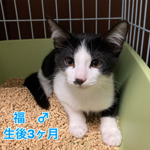 | 特徴(性格など) | 白黒ハチワレの男の子 性格は食欲旺盛、遊ぶの大好きで元気いっぱい |