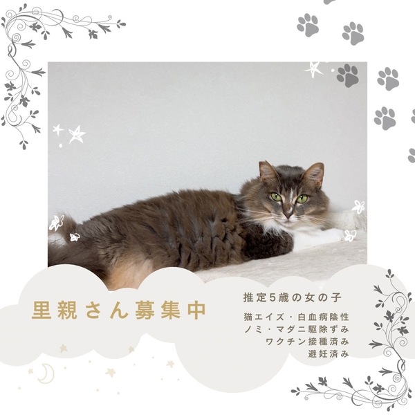 | 性別 | 猫 ♀ | 年齢 | 推定6歳8ヶ月 (2026/03/07 現在 ) |