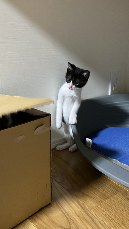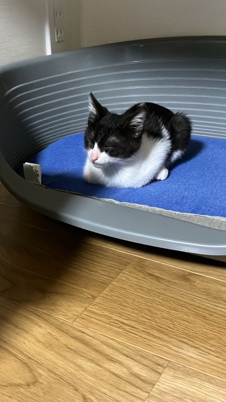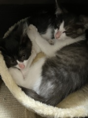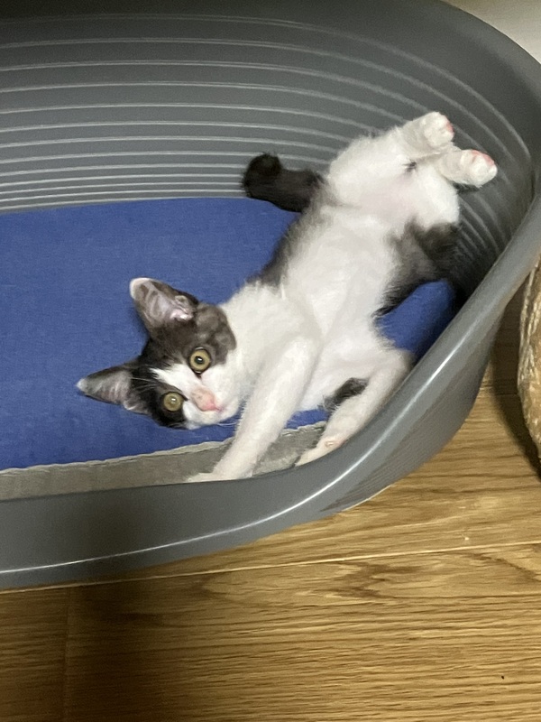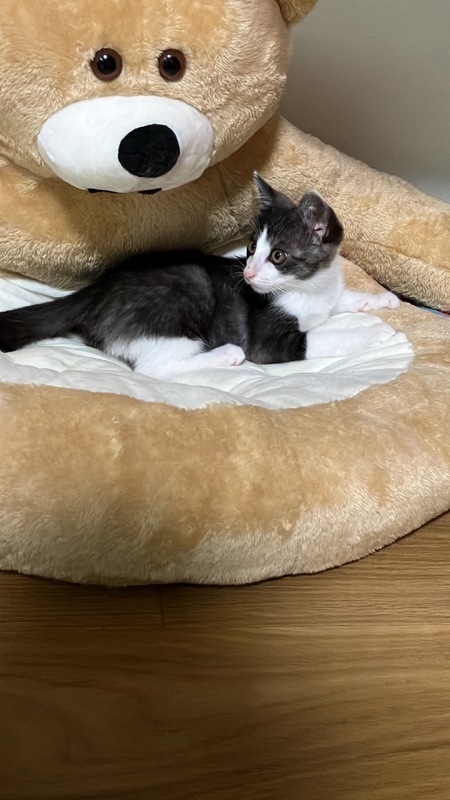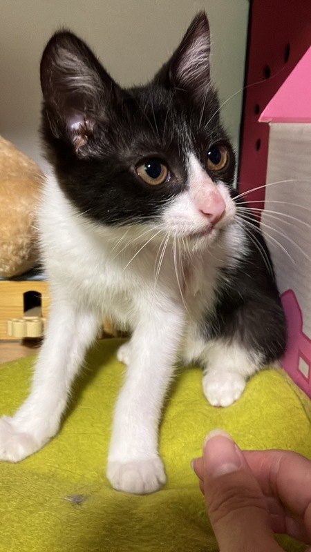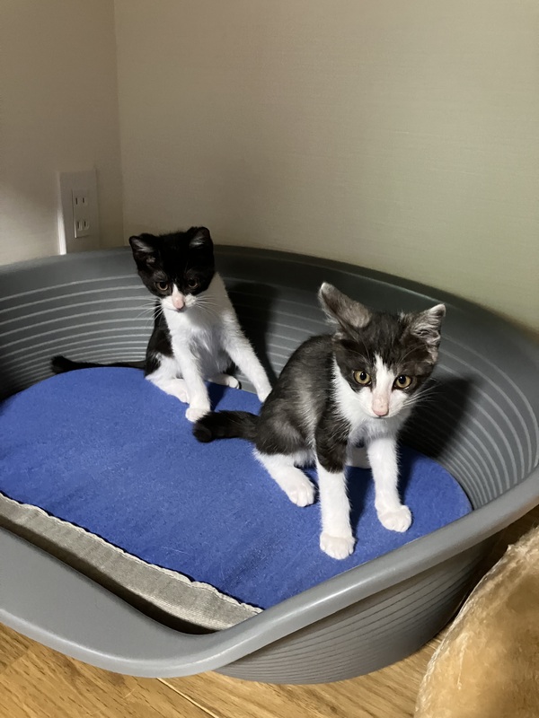 | 特徴(性格など) | <黄身(黒×白)>オス 元気はいいけど、おっとりめ。 賢く器用なタイプ。 人の横にくっついて寝るのが好き。 人の手や足の指を噛み噛みするのが趣味。 <白身(薄墨×白)>オス 活発で走り回ったりかくれんぼしたり子猫らしい子。 でも臆病でちょっと不器用。 人のお膝で寝るのが好き。 座布団やブランケットに隠れて遊ぶのが趣味。 <2頭共通> 保護時はシャーシャー言って手も口も出て攻撃的でしたが、 今は人間にはベタベタゴロゴロにゃんこです。 ただし、対他動物にはまだシャーシャーします。 もしかすると引っ越し後、環境が変わることでしばらくは人間にもシャーシャー言うかもしれません。 トイレは2頭とも使えますが、どちらも砂掛けは熱心ではありません。 2頭で走り回り取っ組み合いしながら遊んでいます。 健康状態は良好で、食欲も旺盛。 離乳食を卒業して子猫用のカリカリを食べています。 どちらの子も、エイズ・白血病ともに陰性 |