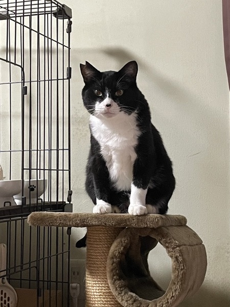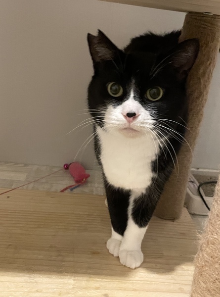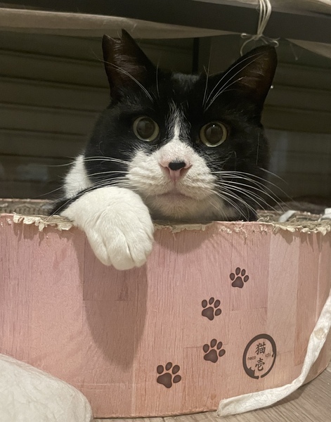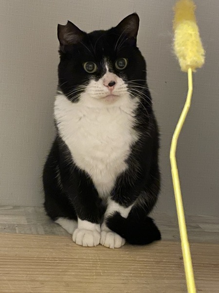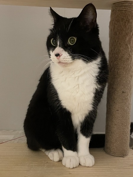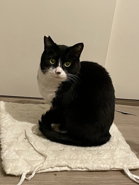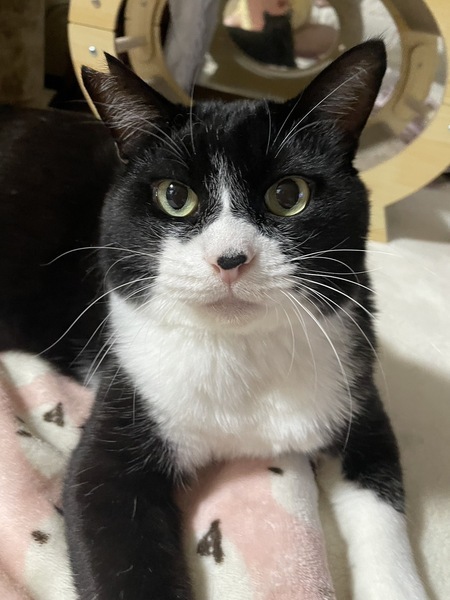 | 特徴(性格など) | 仮名】フルフェイス ○推定8才以上、中高年おじさまキャット ○ハチワレタキシードキャット ○体重5kgのややぽっちゃり体型。 ○鼻の頭の黒ぶちがチャームポイント ○おしりポンポンと撫で撫でが好きです。 ○少々臆病ですが、穏やかないい子です。 ○おもちゃで遊んだり、おふとんフミフミしたり、スリスリしたり、そっと寄り添ってきたり、可愛い鳴き声の持ち主だったりと可愛いおじさま猫です。 |
