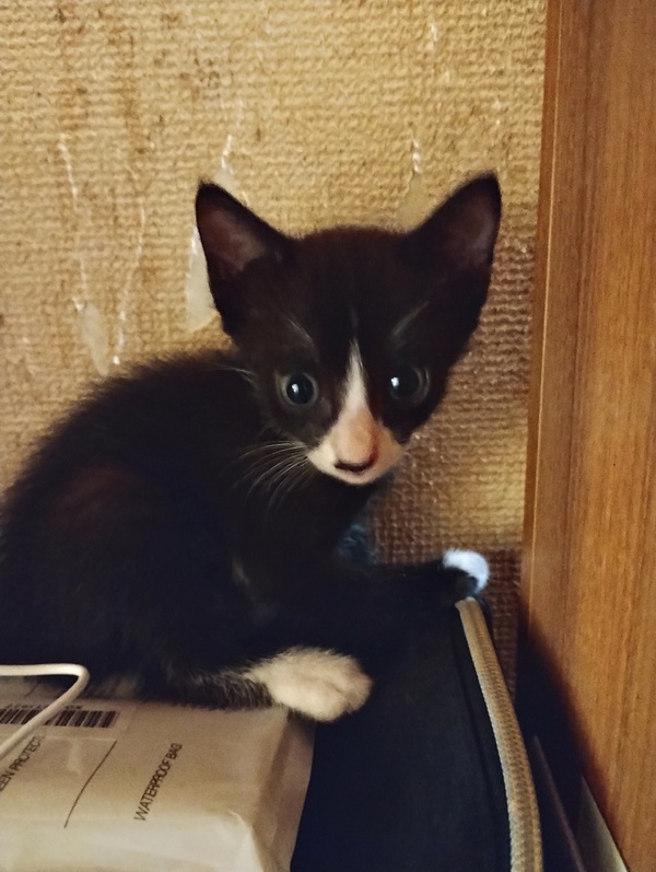| 特徴(性格など) | 黒のハチワレの子猫です。 片足2本だけ まだら模様のある子です。 よく食べ、よく遊ぶ可愛い子です。 トイレも覚えました。 |