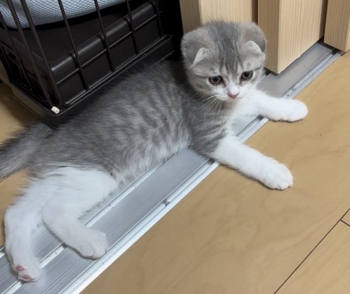 | 特徴(性格など) | カラー:シルバータビー 甘えんぼうです。 お腹がすいた時、かまって欲しい時に甘え鳴きします。 好奇心旺盛なのでヨチヨチ歩いたり走り回ったりしてます。 ベットでも寝てくれます。 お目目がくりくりがチャームポイントです。 短毛です。 ふやかした餌から今はカリカリの餌を食べてます。(ロイヤルカナン子猫前期) |
