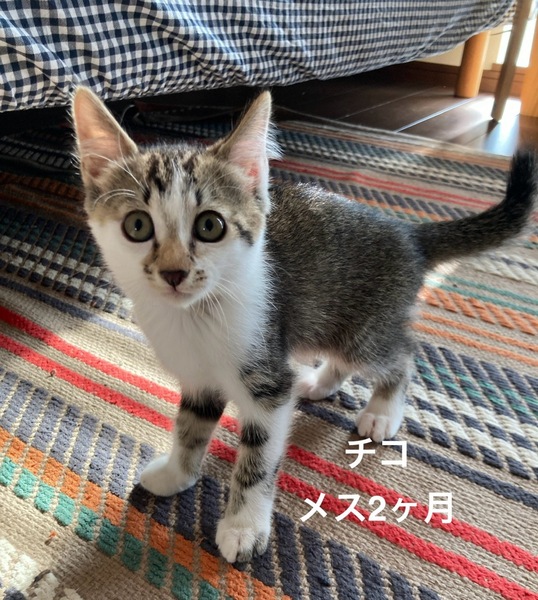 | 特徴(性格など) | 毛色:キジシロ 性格:3ヶ月のいとこたちに混じり1匹だけおチビですが、負けずにぴょんぴょん跳ね回りニャンプロしてとても元気です。強気女子で可愛い猫パンチ炸裂させますが、抱っこもできます。 体重:約850グラム(2024.7現在) マイクロチップ装着: 未 飼養環境制限: 室内のみ 単身応募者: 条件あり 高齢応募者: 否 初期医療処置:内外部駆虫済み ワクチン接種未(2024/7中接種予定) 注意事項・その他:母娘3匹からそれぞれ生まれた子たちを保護しているので、いとこ同士で保護し過ごしています。チコちゃんのきょうだいはまだ保護できておらず、これから保護予定。猫同士でとても楽しく遊ぶのでぜひ2匹以上で迎えていただきたいです! |