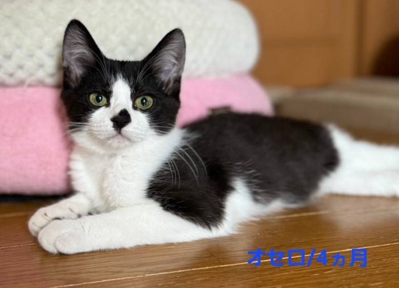 | 特徴(性格など) | オセロ 毛色:白黒 性格:ちょっぴり怖がりさんですが、兄妹達とくんずほぐれつ元気に遊んでいます。すばしっこい男子。ニャンリンピックの100m走に出したい。いや、走り高跳びかな。 体重:約1.6キロ(2024.7現在) マイクロチップ装着: 未 飼養環境制限: 室内のみ 単身応募者: 条件あり 高齢応募者: 条件あり 初期医療処置: ワクチン接種2回済み(2024/6/26) |