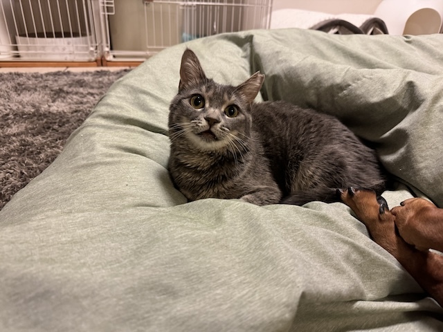 | 特徴(性格など) | ☆☆☆ご希望の方は、以下のアンケートフォームにご記入の上、送信してください☆☆☆ ねこ親希望アンケート→ http://chibawan.net/contactform_cat 【猫No】3822 【愛称】ポム 【性別】メス 【年齢】推定8才(16/02頃生) 【毛色】灰 【体重】3.5kg(25/01/10現在) 【状態】ワクチン接種済(24/09/30)、血液検査(エイズ(ー)、白血病(ー))、検便(ー)、ノミダニ駆除済、避妊手術済、マイクロチップ装着済 【預かり場所】東京都文京区 【日記】tsunko1231(インスタグラム)https://www.instagram.com/tsunko1231/ 【経緯】横浜市動物愛護センターより引き出し 【性格・その他】怖がりな面もありますが、慣れるととても甘えん坊で人の後をついてきて頭をスリスリしてくるような子です。 慣れるまでに時間はかかりますが、ご飯をくれる人にはいちばん懐き、甘えたか細い声で鳴いて撫でられるのを待っています。 預かり宅では猫とも犬とも一緒に生活しており、他の動物は好きなようで、自分から擦り寄ったり、一緒に寝たりもしますので、先住の子がいても比較的うまくやっていけるタイプです。 気の強さはなく、野良猫時代に怖い思いをしたのか人間の動きにだけはどうしても咄嗟に怖がり逃げてしまいがちですが、他の動物のことは怖くないようです。 人間の動きには敏感なため小さなお子さんとの同居は向かないと思います。 一緒に寝転がっていたり、座っていれば自分から頭突きしながら擦り寄ってきたり、撫でられてゴロゴロ言ったりしますし、チュールなども大好きで日常では困ることはありません。 ただ、抱っこ含め、捕まることにはどうしても反射的に身構えてしまい、外で会ったらご飯は食べに来るしニャーニャー鳴いて催促するのに捕まらない猫のような雰囲気です。 落ち着いているご機嫌な時なら抱っこもできるようにはなってきているので、気長に怖くないことを教えていけば変わってくると思います。 環境が変われば落ち着くまでは警戒心が強く出ることもあるでしょうが、気長に見守っていけば生活する上で問題はありません。 現在はお留守番もフリーで過ごし、トイレも鉱物系の砂できちんとしてくれ、粗相はありません。 胆管肝炎と予想される既往があり、完治は望めませんのでずっと経過観察しつつお付き合いしていく形になります。 現在は夜のみの投薬で経過観察しており、体調が悪くなれば治療をしていくようになるかと思います。 今まで外で頑張ってきて、持病があるものの、お腹を出してくつろいだり可愛らしい姿を見せるようになり、擦り寄って甘えることもするようになったポムをポムのペースで見守ってくださるご家族に迎えていただけたらと思っています。 ポムのペースで、一緒に寝転がったり、穏やかに一緒の時間を過ごしていただける大人のご家庭が向いているかと思います。 【その他】愛情いっぱいの終生飼育、継続的な治療と定期的なワクチン接種などの健康管理をお約束いただけ、完全室内飼育で迷子防止に細心の注意を払ってくださるご家庭でアンケートに快くお答えいただける方からのお問い合わせをお待ちしています。 預かり宅から1時間以内のご家庭からのアンケートをお待ちしております。 なお大変申し訳ありませんが、同棲カップル、高齢の方のご家庭からのお申込みについてはお断りさせていただきますのでご了承ください。 ※猫との暮らしが初めてのお子さまには、アレルギー検査をお勧めしております。(短時間猫と触れ合った経験だけではアレルギーの有無はわかりません) 責任ある終生飼育には必要なことですので、ご理解下さいませ。 |