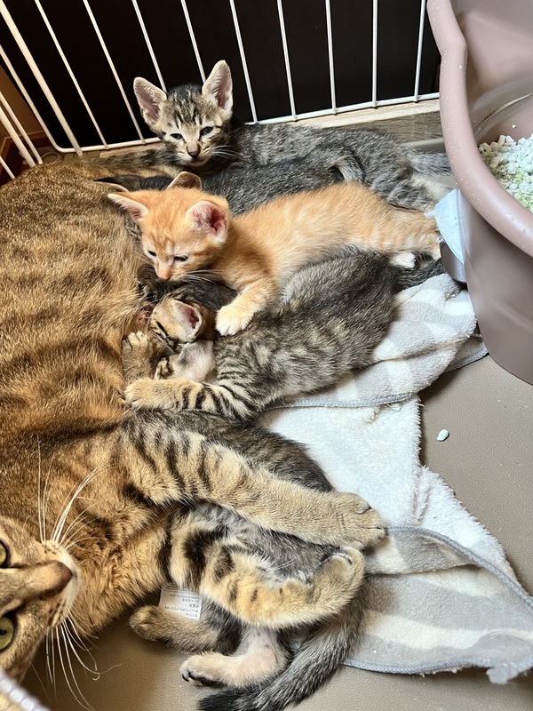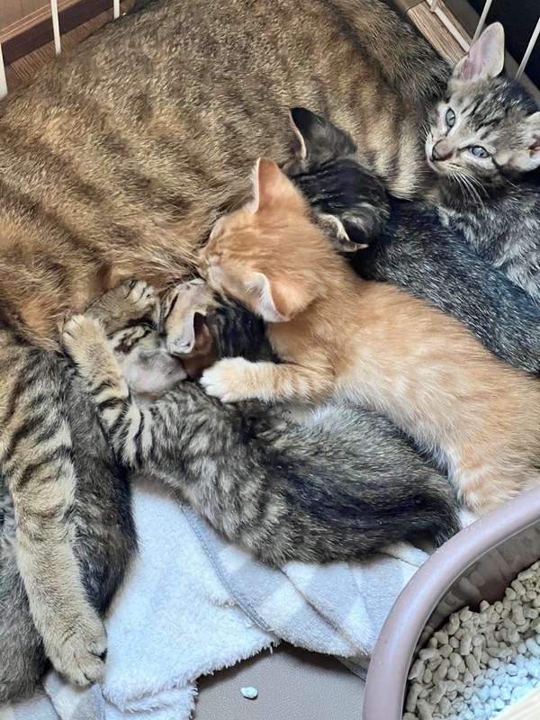 | 特徴(性格など) | キジトラ 母猫はとても人懐こく、甘えん坊です。 子猫たちは少しやんちゃな子もいれば、おとなしい子もいます。ほぼ乳離れしており、自分でおトイレもできます。 |