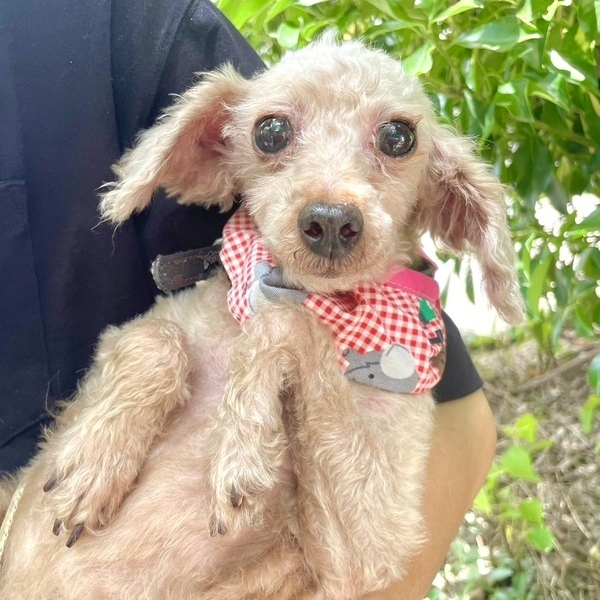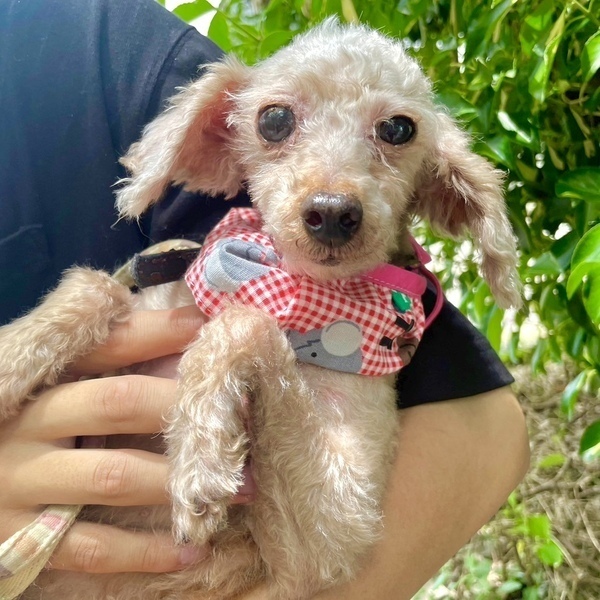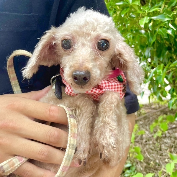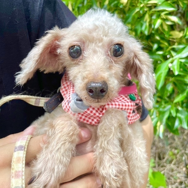 | 特徴(性格など) | トイプードルの美々(みみ)ちゃん、2.3kg。 おっとりかわいい女の子です。 少し怖がりさんですが、人馴れしていて、なでてもらうのが大好きです。 絶賛お散歩練習中!無駄吠えせず、おとなしい性格です。 同時に募集している芽々ちゃんと姉妹で、一緒に保護しました。芽々ちゃんが大好きで、2匹で仲良くしています。 (芽々:https://satoya-boshu.net/foster/detail.php?@DB_ID@=349886) 美々ちゃんを家族に迎えてくださる方を探しています。 当団体のホームページや他のサイトでも同時に募集を行っています。 少しでも気になられましたら、どうぞお早めにお問い合わせくださいね。 |