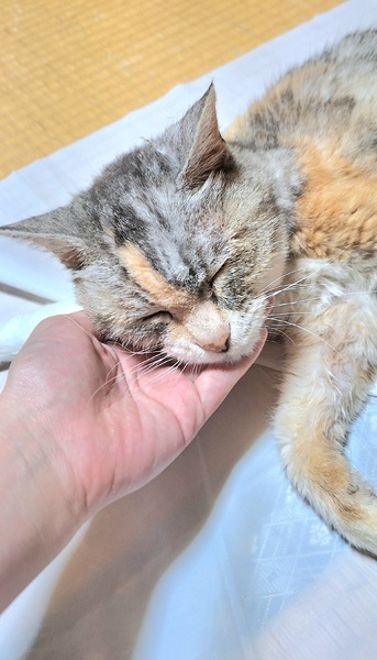 | その他(譲渡条件など) | ~重要なお話~ 保護したばかりなのでまだ詳しいことはわかっていないのですが、腎臓が悪い可能性があります。現在は我が家で点滴をして様子を見ています。ただこの子はとても大人しいので暴れることも少なく点滴がしやすいです。点滴も5分ぐらいで終わるのでそこまで負担にならないと思います。もし里親になりたい方がいましたらこの点を理解していただきたいです。 8月20日追記 点滴が2日に一度になりました!三毛猫も点滴になれてスムーズにできるようになり、とてもやりやすいです。もともと甘えん坊だったのがさらに甘えん坊になって、とてもかわいらしくなりました。 8月10日更新 点滴をうって少しは数値がよくなったものの、毎日点滴をしています。しかし点滴以外はほとんど普通の猫と同じ暮らしができますのでご安心ください。 8月11日追記 点滴のおかげか少しずつ元気になってきて、段ボールを飛び越えたり部屋の奥に入ってかくれんぼしたりしています。とってもかわいい寝顔でお昼寝しています。机の影で寝るのが好きです。 避妊手術と5種混合ワクチンをしていないのは保護したばかりだからです。もしすぐにでも里親になりたい方がいましたら、ご相談ください。 里親になる条件 身分証明書が提示できる 飼育にかかる費用を負担できる ペット可の住宅に住んでいる 家族全員の同意を得ている 完全室内飼いができる 不妊・去勢手術をする 愛情、責任を持って育てる この条件を守っていただける方にお譲りいたします。(もし可能でしたら月に一度でも写真などを送ってくださると大変嬉しいです) 社会人で安定した収入がある方なら、単身者でもお譲りしようと考えています。高齢者の方で引き取りたいという方は一度ご相談ください。 8月15日追記 X(旧Twitter)のアカウントをつくりました。パステル三毛猫の日常をつぶやいているので、よろしければ閲覧してみてください。 https://x.com/JN2wY9wf3K65138 |