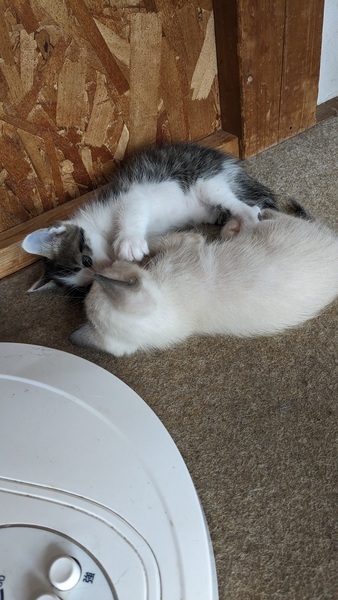 | 特徴(性格など) | 3匹ともきれいな毛並みです。尻尾も真っすぐです。アイボリーの子は目がトルコ石のように深い水色です。 白い毛の子は毛足が長くて背中に黒の斑点が7つあります。 白地にキジトラが混ざった子も目が深いブルーで本当に綺麗です。三匹とも猫の良い所を全部持っている 珍しい子たちです。性格は、おとなしいです。今は成長期なので兄妹でじゃれ合って遊んでいますが、 良く寝る子たちです。無駄鳴きもしませんし、ケージにいる時もおとなしいです。 気が小さいですね。 |