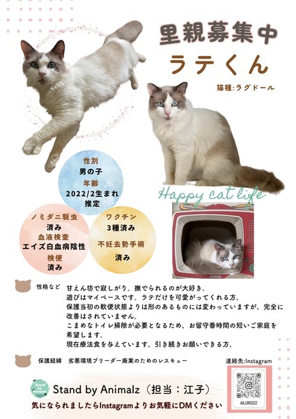 | その他(譲渡条件など) | ・できましたら福岡近郊にお住まいの方 ・ペット飼育可物件にお住まいの方 ・賃貸、集合住宅の方はペット飼育条件が記された書類のご提示をお願いしています。 ・脱走防止対策を施していただける方 ・トライアル時にご自宅の飼育環境の訪問確認に同意いただける方。 ・同居のご家族全員の賛同を得ている方 ・ご家族にアレルギーや喘息の方がいらっしゃる場合は、医師にご相談の上ご検討をお願いしております。 ・譲渡時にそれまでにかかった医療費などのご負担をお願いしています。 ・生活保護、学生さん、アルバイトの方は基本的にお断りしております。 ・お引っ越しの際には必ずご連絡をくださる方。 ・完全室内飼い希望 |