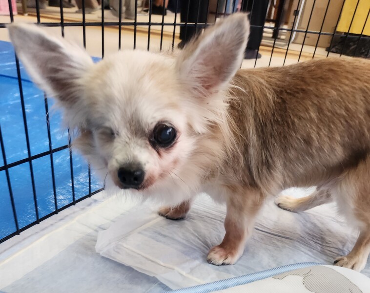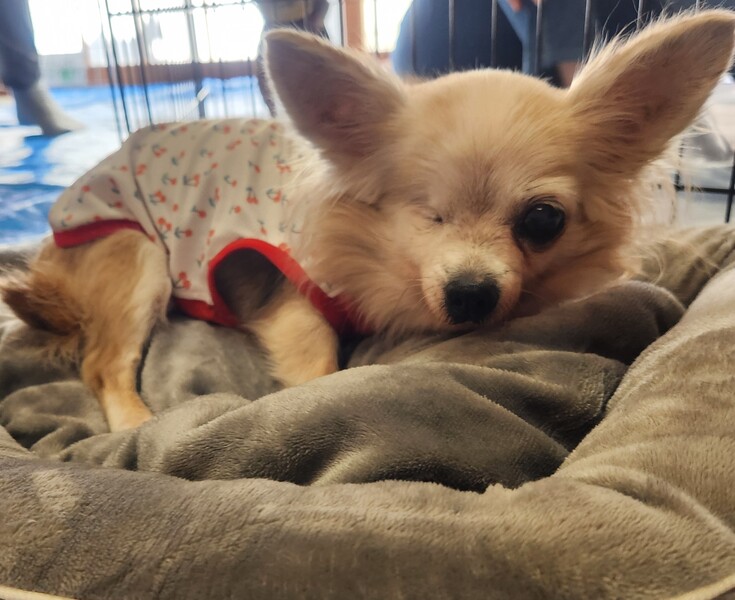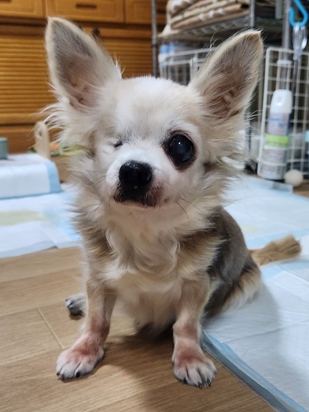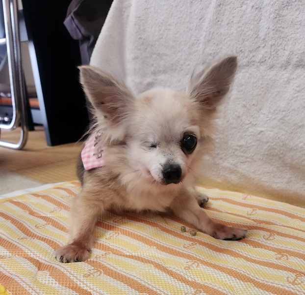 | 特徴(性格など) | 名前:さくらちゃん 年齢:推定12~15歳 性別:メス 体重:3.6キロ( 通常体型 ) 避妊手術済み マイクロチップ挿入と登録済み 歯のスケーリングと抜歯 乳腺腫瘍摘出(極小さな物が1ヶ所) 心音( 心雑音あり レベル2/6程度 ) 検便( - ) 血液検査済み(高い低いはありますが、特に異常なし ) フィラリア検査:陰性 5種混合ワクチン1回済み(2023年9月) 狂犬病予防接種済み ノミダニ駆虫薬投薬済み 膝蓋骨脱臼(パテラ)左右ともに無し 胆泥症あり(現在、特に治療はしていません。) 変形性脊椎症が見受けられ、経過観察中。 右眼は当方へ移動してきた時に潰れて日が経ち、痛々しい状態だったので、 眼球摘出手術をして塞いでいます。 残ってる左眼はまだしっかり視力があるようです。 年齢不詳のハイシニア・さくらちゃん。 放浪していた子なので今までの過去は不明ですが、あまり良い飼い方(虐待されてた可能性もあり。)をされていなかったようで人が触ったり、抱っこすると、ガウガウ怒って噛んでくることがあります。 (噛まれても、穴が開いたり、出血したりする程ではないです。) 男の人は苦手かも?(男の人が近付くと、吠えます。) 人にはガウガウ言ってしまうのですが、 犬猫は嫌いじゃないようで多頭の中でも相性が合えば、みんなとワチャワチャしながら生活出来ます♪ 食欲旺盛で食べる事は大好き!! 小粒のドライフード+シニア用の缶詰トッピングなど、 おやつ類も基本好き嫌いはなく、やわらかい物中心に何でも食べています。 トイレは生活スペースに慣れると、ほぼトイレシートとお外で出来ます。 片眼で年相応に足腰が弱いので、ペットシーツから離れた所に居てる時は失敗することもあります。 リードを着ける時にガウガウ言いますが、 着けてしまえば、お外も好きで近所をゆっくりお散歩したりしてます。 現在投薬や治療している病気はありませんが、 持病もあり、ハイシニアなのであとどれぐらい生きれるかは正直分かりませんが、 保護犬のまま一生を終えるのではなく、一般家庭に迎えてもらって〇〇さんちの〇〇ちゃんとしてゆっくり余生を過ごして欲しいと願っています。 |