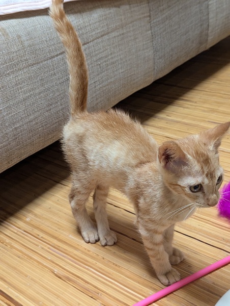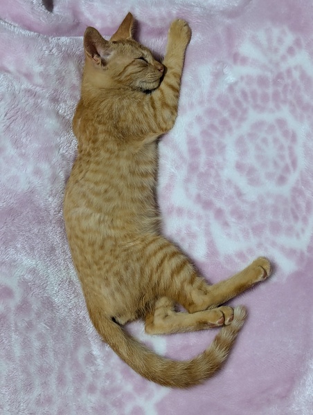 | 特徴(性格など) | クリクリお目々が可愛い 元気いっぱい甘えん坊な茶トラちゃんです。 ゴロゴロスリスリして一緒に引っ付いて寝てくれます。 獣医さんでは注射が終わっても泣いていた泣き虫な所も可愛いです(^^) きょうだいのミケちゃん同様 初めて猫ちゃんと暮らしたい方にも楽しく過ごしていただけるコです。 また、大きな先住猫とも楽しく遊んでいます。 予防接種は鼻が止まり次第予定しております。 |