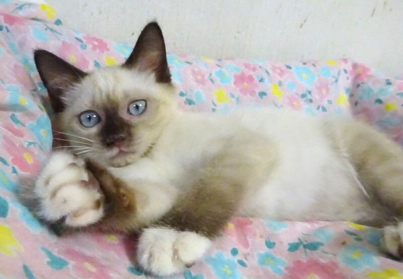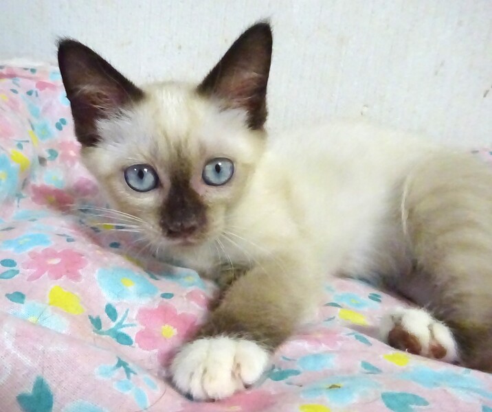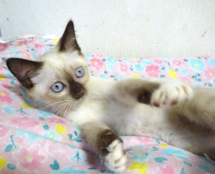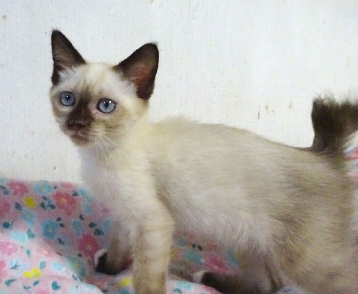 | 特徴(性格など) | 仮名: ノアちゃん、メス 毛色: シャム柄、尻尾短め 性格: 保護してまもないこともあり、個性はまだはっきりとわかりませんが、保護時から威嚇はなく、攻撃性もなく、むしろ最初からフレンドリーで、抱っこも平気でした。爪切り、目薬も大丈夫です。 兄弟もなく、一人っきりなので、今の所は他猫と遊べるかどうかはわかっていません。 外で発見された時はオス猫の近くにいたので、優しい先住猫ちゃんなら大丈夫と思います。 今は、あまり鳴くこともなく、大人しく、じゃらしは目で追うけど、遊んだりはしないようです。 小さいので、暫くは見守りが必要です。 留守番時間は短めのご家庭でお願い致します。 検便済 駆虫済 3種混合ワクチン済 猫エイズ・白血病ウィルス検査はともに陰性です |