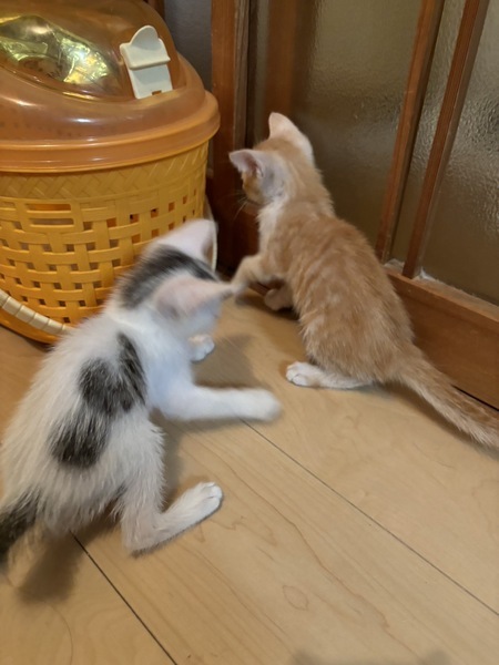 | 特徴(性格など) | 茶トラ(オス)→好奇心旺盛で賢いです。 白黒ブチ(オス?メスの可能性も)→人懐こく甘えん坊です。 人馴れしていて撫でると喉を鳴らして甘えてきます。 感情が高ぶると甘噛みする事があります。 |