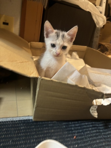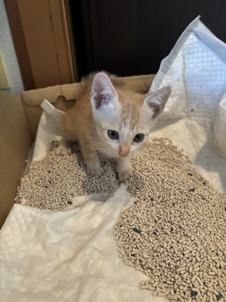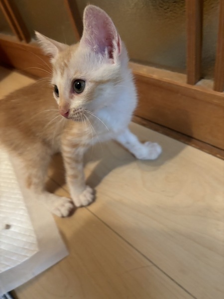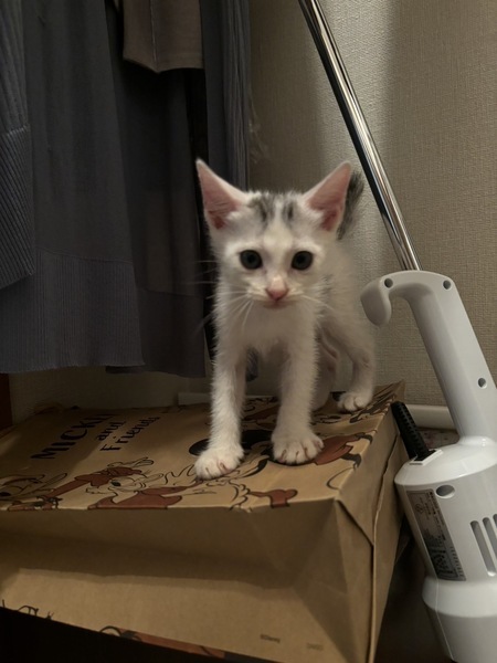| 里親募集する理由 | 8月17日の夜、都城市内の車通りの多い道路の目の前の駐車場でずっと鳴いていたので保護しました。 先住猫が2匹いるため、経済的に飼えず里親さんを探しています。 |
