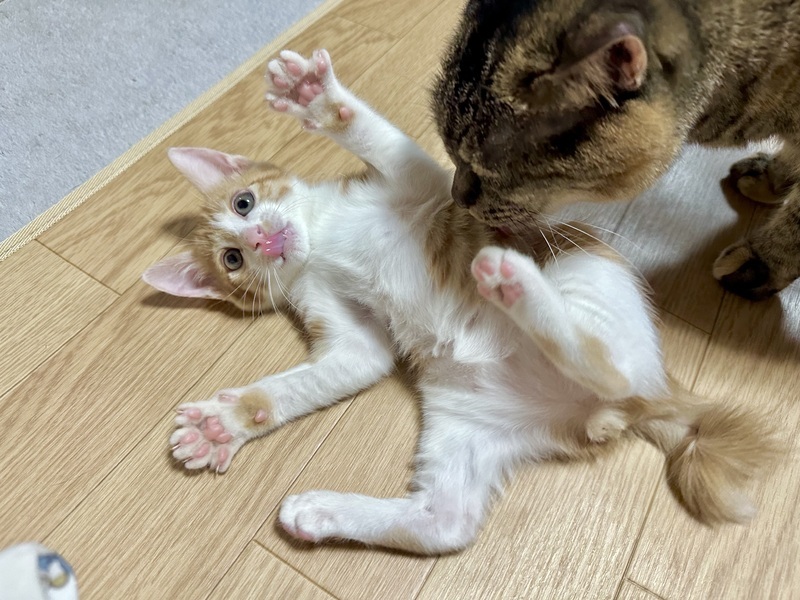 | 特徴(性格など) | 茶白の男の子です。 尻尾が子豚のようにくるくるとなってます。 我が家の犬と猫と一緒に元気に走り回る負けず嫌いな男の子です。 |