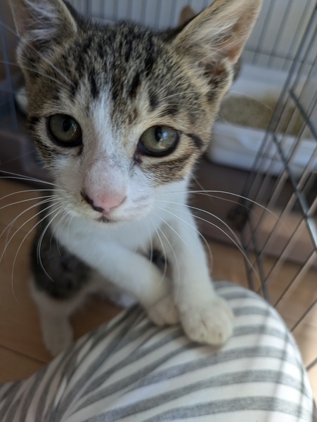 | 里親募集する理由 | 猛暑の中、ママ猫と二人三脚で頑張っていました。 生粋の野良猫ではなく、人への距離が近く、お家での暮らしができる兆しがあり優しい里親さんの元で伸び伸び育って欲しいと思い、募集いたします。 保護した時は、風邪をひいて目やにで開けにくそうでしたが、初めてのお薬、目薬、爪切りもなんなくこなしてくれました。優しいお顔と性格が愛らしい子です。 |