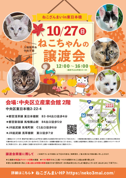 | その他(譲渡条件など) | 11:30より、2階会場入口にて受付を開始します。 受付時に入場予定時間が記入された整理券をお配り致しますので、整理券を受け取った方はお時間になりましたら2階会場入口に番号順にお並び下さい。 ※11:30より早くいらしてもお待ちいただく場所がございません。 また、近隣にお住まいの方や他階フロアのご利用者様にご迷惑となる場合がございますので、受付開始時間にあわせてお越しくださいますよう、何卒ご協力お願いいたします。 ※ねこざんまい譲渡会は、先着順で里親様を決定する譲渡会ではありません。 先に申し込みをした方を優先することもありません。 お話をして、その猫ちゃんに合ったおうちに決めさせていただいております。 12時に開場し、里親様の決定は14時以降となります。 14時以降にご入場の場合、希望の猫ちゃんが決定している可能性があります。 また1頭に対し多数のご希望をいただいた場合、早めに申し込みを締め切らせていただく場合がございますので、予めご了承下さい。 里親様決定は14時以降となります。 その後、迎え入れ準備の説明等のお時間も頂戴しますので、お時間に余裕を持ってご来場下さい。 ~~~~~~~~~~~~~~~~~~~~~~~~~~~~~~ ★仔猫ご希望の里親様★ 仔猫ちゃんたちは、まだ体がしっかりしていない赤ちゃんです。 下痢だけでも数時間対応ができなかっただけ死に至る事もあります。 その為、月齢に応じたお留守番時間を設けさせていただいております。 また、子猫ちゃん(6ヶ月未満)の里親様には子猫支援金のご協力をお願い致しております。 ★猫ちゃんとのお見合いは譲渡会で!★ ねこざんまいの猫ちゃんは譲渡会でのお見合いのみとなります。 『この子はいつ譲渡会に参加するの?』『譲渡会場の場所はどこ?』などは、ねこざんまいホームページをご覧ください。 https://neko3mai.com/ ★楽しく猫ちゃんと触れ合って★ ねこざんまい譲渡会は、猫ちゃんも里親様も保護主も笑顔で過ごせる譲渡会を目指しています。 これから20年以上、楽しい時も、悲しい時もいつも傍にいてくれる大切な家族になる猫ちゃんです。 会場には沢山の猫ちゃんがいます。 1匹1匹、触れ合って猫ちゃんとお話してください。 『初めて猫ちゃんを家族に迎える方』 『先住猫ちゃんのお友達を迎える方』など トライアルの仕方や先住猫ちゃんと仲良くなるコツなど経験豊富な保護主やスタッフにお気軽にご相談ください! 猫を愛し、そして猫に愛されている猫好きスタッフと保護主がアドバイスさせていただきます。 ★里親希望のみなさまへ★ ペットではなく、家族一員としてたっぷり愛情を注いでくださるご家庭をお待ちしております。 恐れ入りますが ●学生の方 子猫・幼猫希望の60才以上の方のみのご家庭 ●脱走防止対策にご協力いただけない方 は原則譲渡を遠慮させていただいております。 ●一人暮らし・同棲(事実婚)の方 保護主の希望や猫の年齢・性格等により、ご希望に添えない場合もございます。 参加猫ちゃんは、それぞれ保護主(実際に猫ちゃんを自宅に入れ、保護をしている方)が異なります。 詳しい条件なども異なる場合がございますので、会場内で直接保護主とお話ください。 〖共通条件〗 1.終生飼育 2.完全室内飼い 3.脱走防止対策へのご協力 4.避妊去勢手術 5.契約書類へのサイン 6.定期報告 7.医療費等の負担 当日の猫ちゃんを連れて帰ることはできません。後日、保護主が里親様のご自宅までお届け致します。 その為、移動の際の猫ちゃんの負担を月齢などから考慮し、お届け地区を限定させて頂くこともございますのでご了承ください。 ご理解とご協力のほど宜しくお願い致します。 ☆よくある質問☆ ・譲渡の条件 ・ご負担頂く費用 ・譲渡会の場所等は ホームページに詳しく掲載させて頂いておりますのでご覧ください。 https://neko3mai.com/ メールでのお問い合わせはすぐにご返答出来ない場合がございますのでご了承ください。 ホームページ https://neko3mai.com/ お問い合わせ http://www.neko3mai.com/contact/form_general.html ねこざんまいブログ http://ameblo.jp/neko3mai/ |