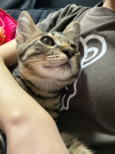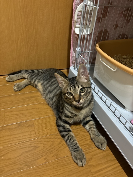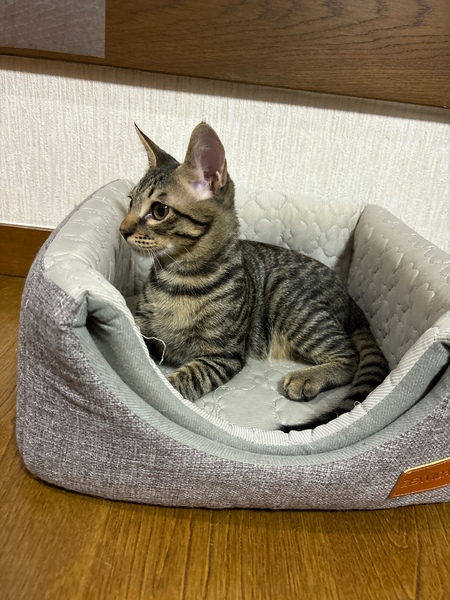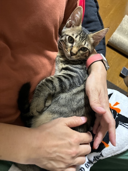 | 特徴(性格など) | キジトラ特有のおでこの模様が濃くピアノの鍵盤のように見えるので、ピアノと呼んでいます(新しいおうちでは変えていただいても構いません)。 とても人懐っこく、抱っこや爪切りも大人しくさせてくれます。 新しいおうちにもすぐに慣れてくれると思います。 ご飯もしっかり食べてくれるいい子です。今のところフードの選り好みはあまりしないです。 エイズ、白血病ともに陰性です。 |