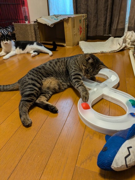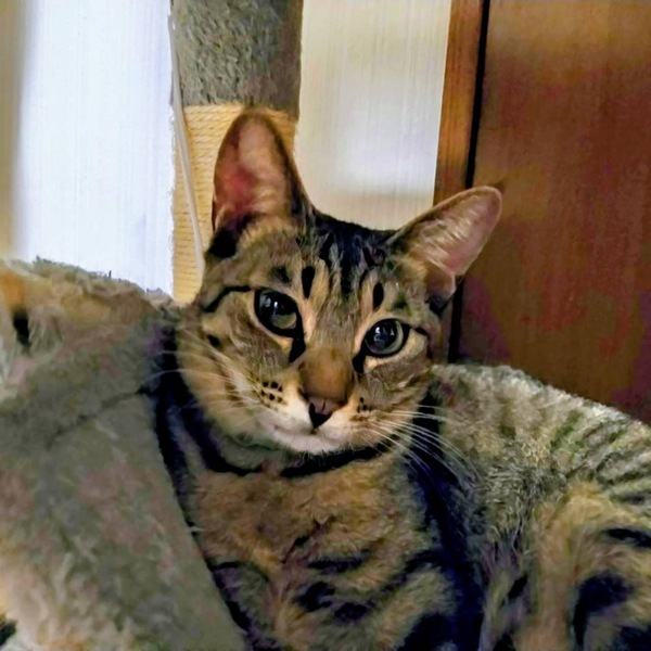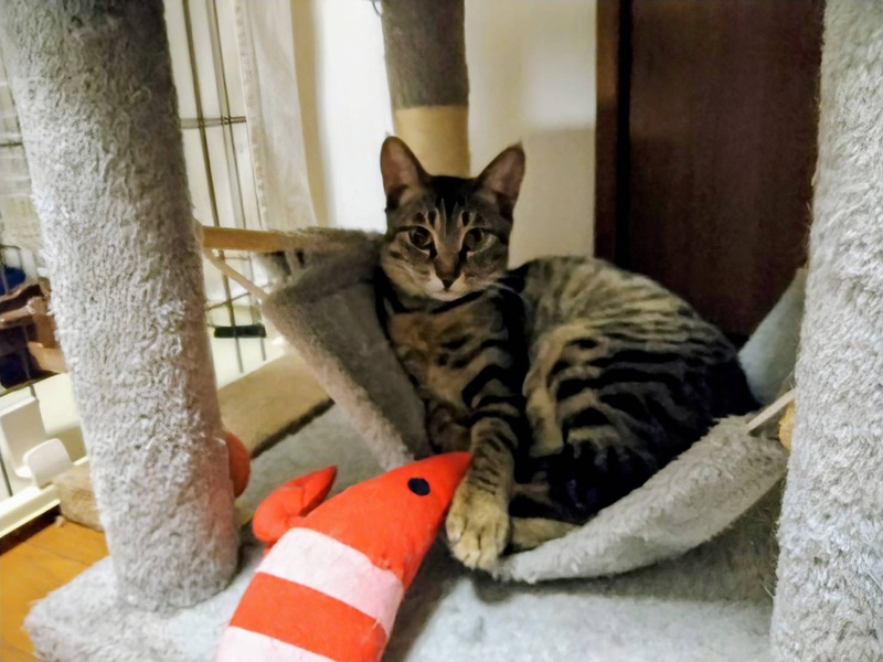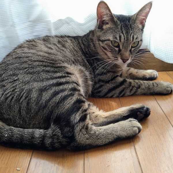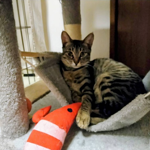 | 特徴(性格など) | 人も猫も大好きですが、独立心が高く一人遊びもとても上手な女の子です! ちょっとやそっとじゃ驚かない肝の座った面もあって、バタバタしないで落ち着いた行動を取り気品を感じます! ごはんは好き嫌いなくなんでも良くきれいに食べてくれます(食いしん坊寄りです)。 代表的なキジトラ模様で、背中やお腹周りは丸いヒョウ柄が特徴です。凛とした表情がたまらなく可愛い子です! |