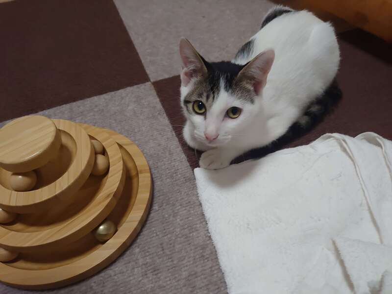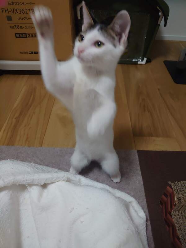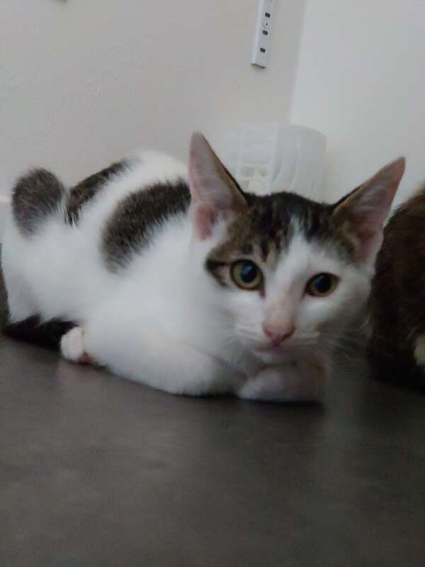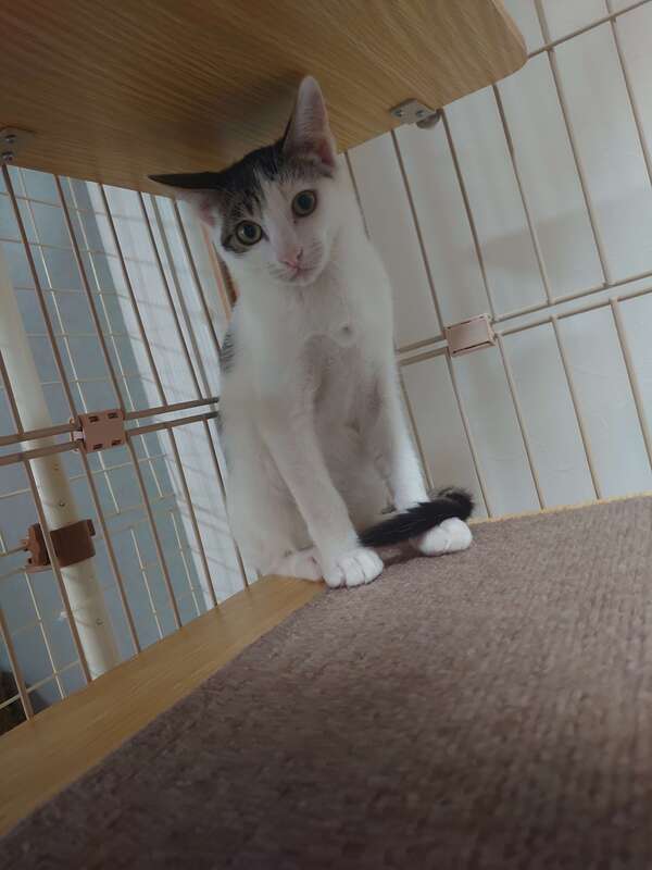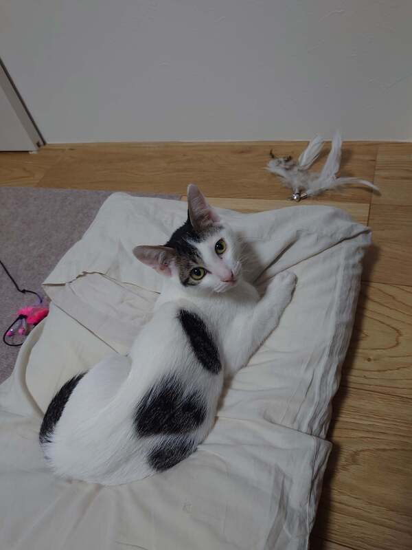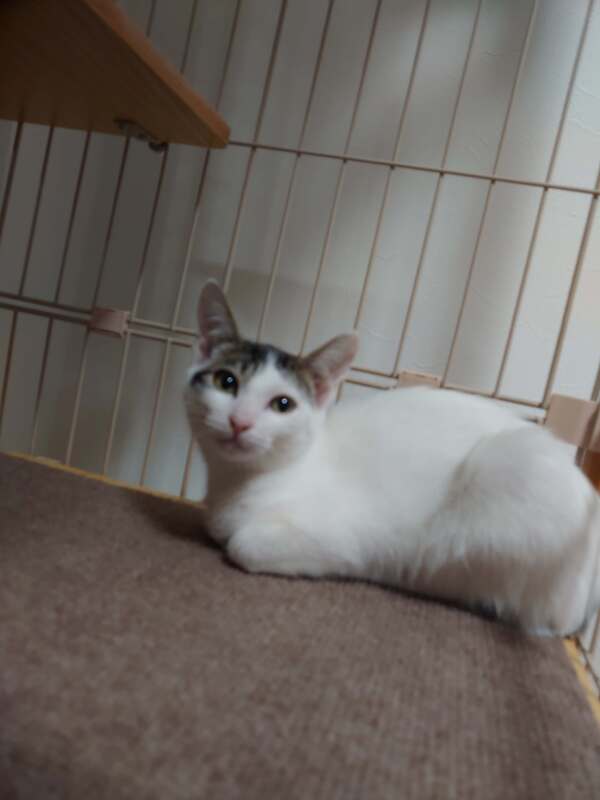 | 特徴(性格など) | エイズ・白血病ともに陰性でとても元気な男の子で 全体的に白色が多く背中の右半分に3つの丸いキジ柄模様があります。 人間に対しては少し臆病ですが、初対面の我が家のネコに直ぐに挨拶できネコさんが大好きです。 現在人馴れ訓練中でじゃらしで遊びまくってます。 掲載№C350335の仔と兄弟です。 |